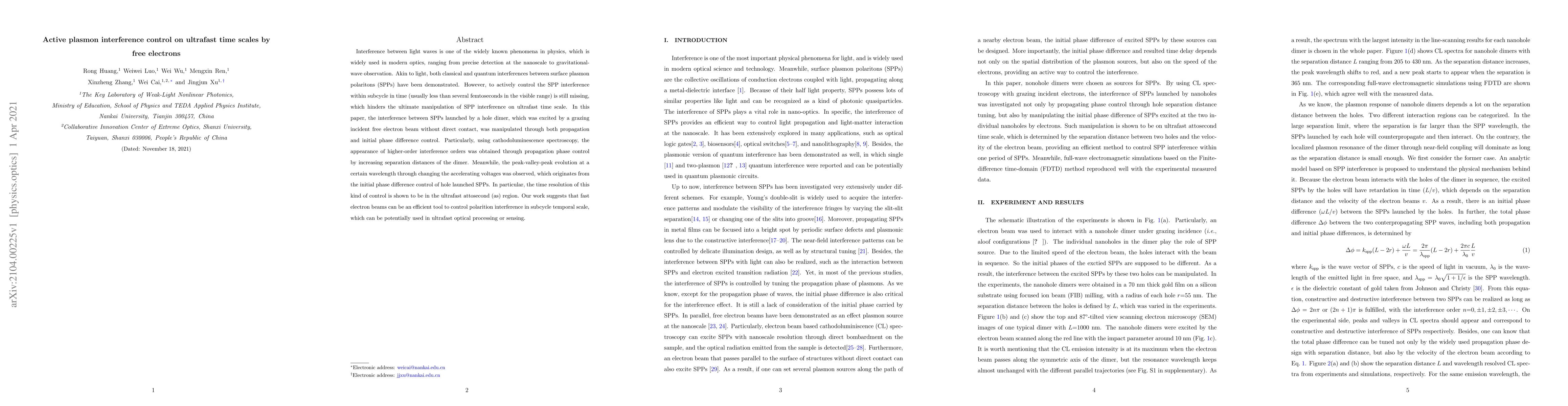 Interference between light waves is one of the widely known phenomena in physics, which is widely used in modern optics, ranging from precise detection at the nanoscale to gravitational-wave observation. Akin to light, both classical and quantum interferences between surface plasmon polaritons (SPPs) have been demonstrated. However, to actively control the SPP interference within subcycle in time (usually less than several femtoseconds in the visible range) is still missing, which hinders the ultimate manipulation of SPP interference on ultrafast time scale. In this paper, the interference between SPPs launched by a hole dimer, which was excited by a grazing incident free electron beam without direct contact, was manipulated through both propagation and initial phase difference control. Particularly, using cathodoluminescence spectroscopy, the appearance of higher-order interference orders was obtained through propagation phase control by increasing separation distances of the dimer. Meanwhile, the peak-valley-peak evolution at a certain wavelength through changing the accelerating voltages was observed, which originates from the initial phase difference control of hole launched SPPs. In particular, the time resolution of this kind of control is shown to be in the ultrafast attosecond (as) region. Our work suggests that fast electron beams can be an efficient tool to control polarition interference in subcycle temporal scale, which can be potentially used in ultrafast optical processing or sensing.