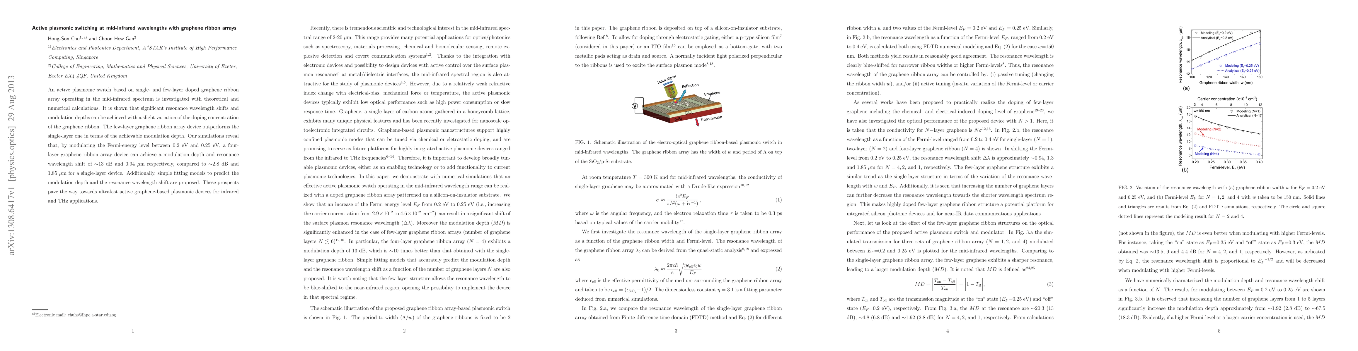 This paper investigates an active plasmonic switch using doped graphene ribbon arrays in the mid-infrared spectrum, demonstrating significant wavelength shifts and modulation depths with varying doping concentration. Few-layer graphene ribbons show greater modulation depth compared to single-layer, with a four-layer array achieving a modulation depth of ~13 dB and a resonance shift of 0.94 micron.