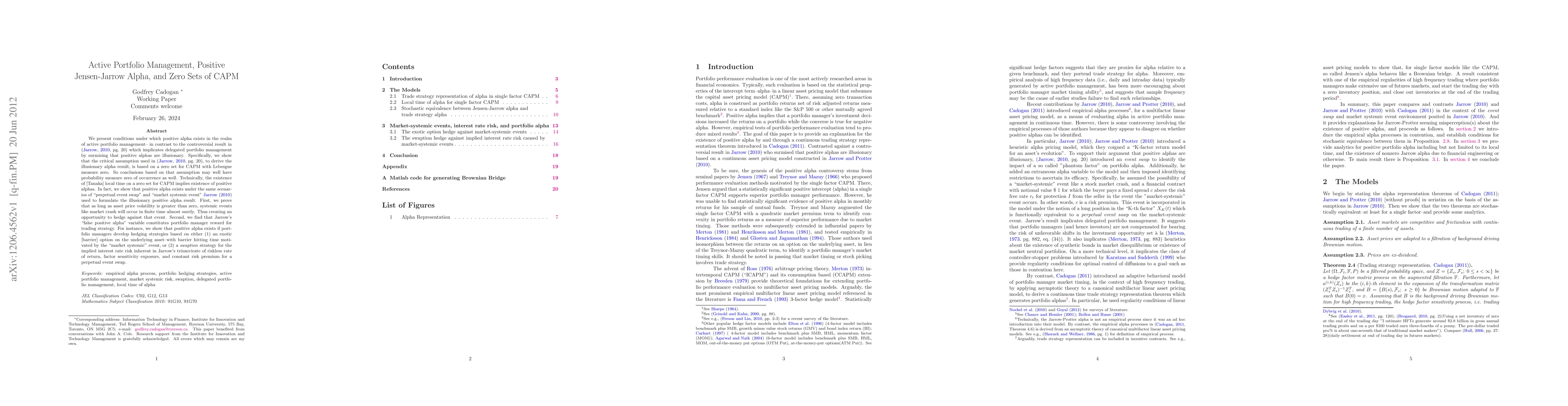 We present conditions under which positive alpha exists in the realm of active portfolio management- in contrast to the controversial result in Jarrow (2010, pg. 20) which implicates delegated portfolio management by surmising that positive alphas are illusionary. Specifically, we show that the critical assumption used in Jarrow (2010, pg. 20), to derive the illusionary alpha result, is based on a zero set for CAPM with Lebesgue measure zero. So conclusions based on that assumption may well have probability measure zero of occurrence as well. Technically, the existence of [Tanaka] local time on a zero set for CAPM implies existence of positive alphas. In fact, we show that positive alpha exists under the same scenarios of "perpetual event swap" and "market systemic event" Jarrow (2010) used to formulate the illusionary positive alpha result. First, we prove that as long as asset price volatility is greater than zero, systemic events like market crash will occur in finite time almost surely. Thus creating an opportunity to hedge against that event. Second, we find that Jarrow's "false positive alpha" variable constitutes portfolio manager reward for trading strategy. For instance, we show that positive alpha exists if portfolio managers develop hedging strategies based on either (1) an exotic [barrier] option on the underlying asset - with barrier hitting time motivated by the "market systemic" event, or (2) a swaption strategy for the implied interest rate risk inherent in Jarrow's triumvirate of riskless rate of return, factor sensitivity exposure, and constant risk premium for a perpetual event swap.