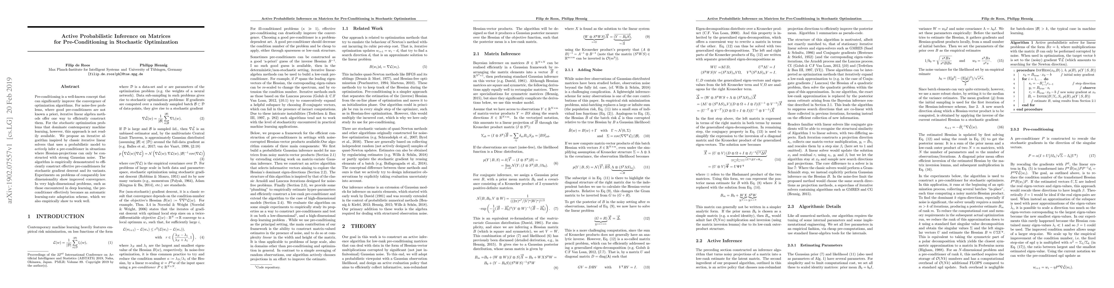This paper proposes an iterative algorithm for constructing pre-conditioners in stochastic optimization, using active probabilistic inference on matrices to adapt to noisy Hessian-projections. The algorithm demonstrates improved convergence in both low and high-dimensional problems, functioning as an automatic learning-rate adaptation scheme in deep learning contexts.