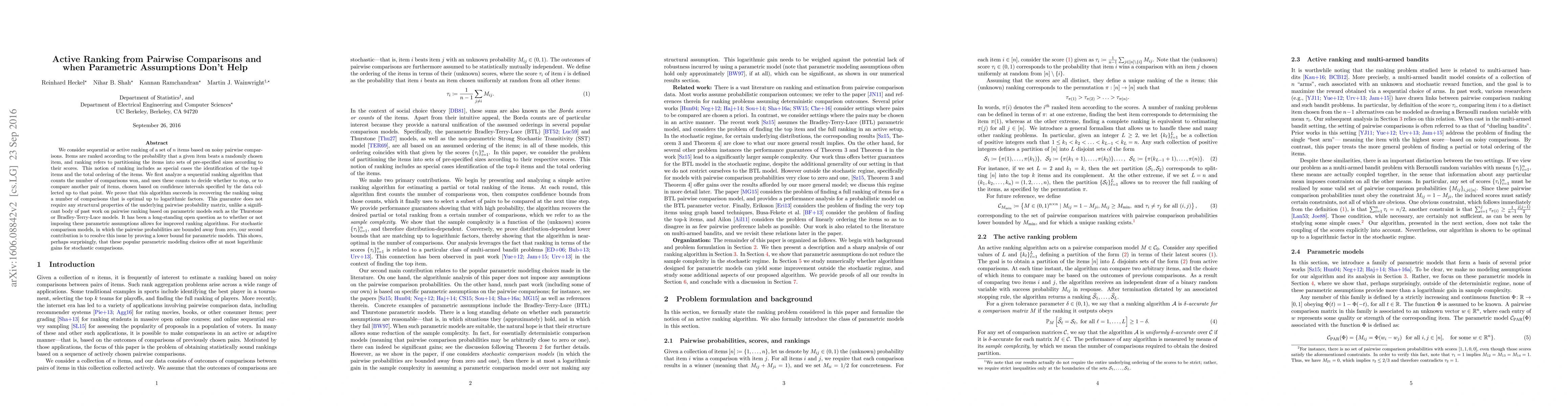 We consider sequential or active ranking of a set of n items based on noisy pairwise comparisons. Items are ranked according to the probability that a given item beats a randomly chosen item, and ranking refers to partitioning the items into sets of pre-specified sizes according to their scores. This notion of ranking includes as special cases the identification of the top-k items and the total ordering of the items. We first analyze a sequential ranking algorithm that counts the number of comparisons won, and uses these counts to decide whether to stop, or to compare another pair of items, chosen based on confidence intervals specified by the data collected up to that point. We prove that this algorithm succeeds in recovering the ranking using a number of comparisons that is optimal up to logarithmic factors. This guarantee does not require any structural properties of the underlying pairwise probability matrix, unlike a significant body of past work on pairwise ranking based on parametric models such as the Thurstone or Bradley-Terry-Luce models. It has been a long-standing open question as to whether or not imposing these parametric assumptions allows for improved ranking algorithms. For stochastic comparison models, in which the pairwise probabilities are bounded away from zero, our second contribution is to resolve this issue by proving a lower bound for parametric models. This shows, perhaps surprisingly, that these popular parametric modeling choices offer at most logarithmic gains for stochastic comparisons.