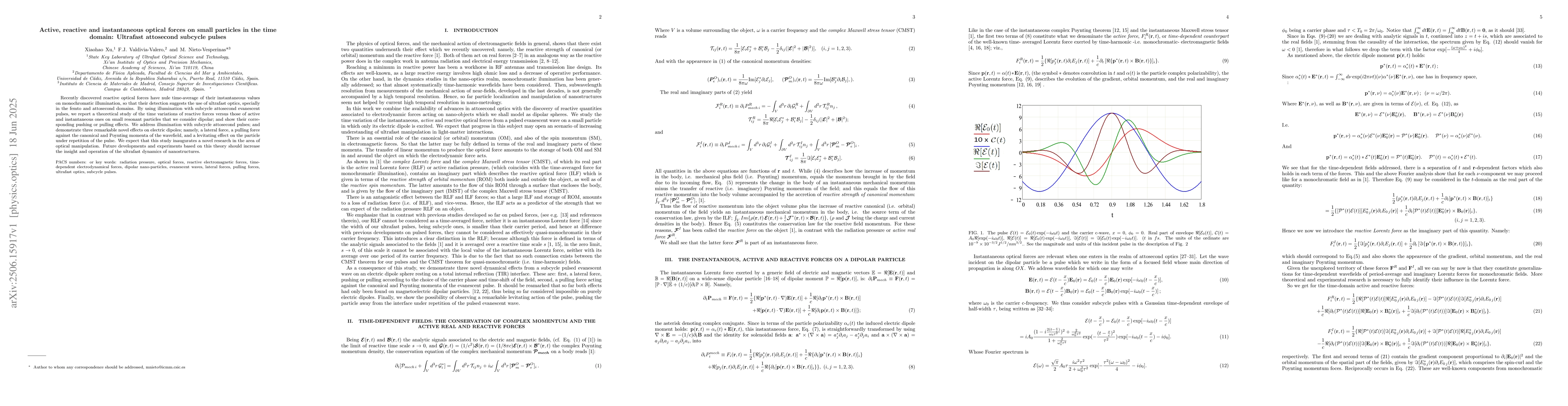 Recently discovered reactive optical forces have nule time-average of their instantaneous values on monochromatic illumination, so that their detection suggests the use of ultrafast optics, specially in the femto and attosecond domains. By using illumination with subcycle attosecond evanescent pulses, we report a theoretical study of the time variations of reactive forces versus those of active and instantaneous ones on small resonant particles that we consider dipolar; and show their corresponding pushing or pulling effects. We address illumination with subcycle attosecond pulses; \rr and demonstrate three remarkable novel effects on electric dipoles; namely, a lateral force, a pulling force against the canonical and Poynting momenta of the wavefield, and a levitating effect on the particle under repetition of the pulse. We expect that this study inaugurates a novel research in the area of optical manipulation. Future developments and experiments based on this theory should increase the insight and operation of the ultrafast dynamics of nanostructures
