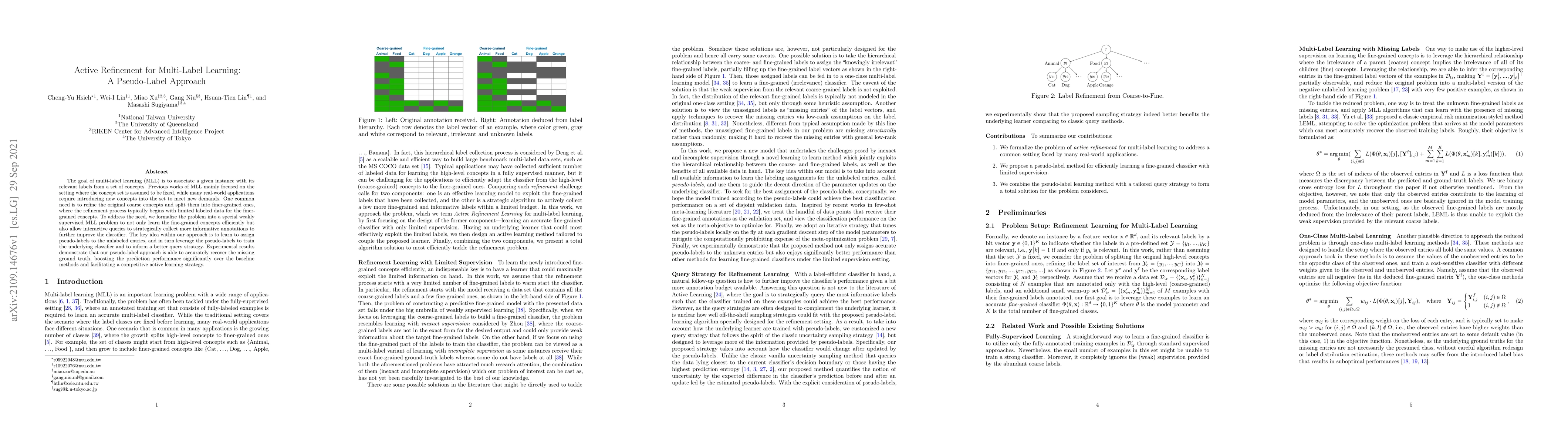 This paper proposes a pseudo-label approach for active refinement in multi-label learning, enabling the efficient learning of fine-grained concepts from limited labeled data and improving classifier performance through strategic annotation collection. Experimental results show significant performance gains over baseline methods.