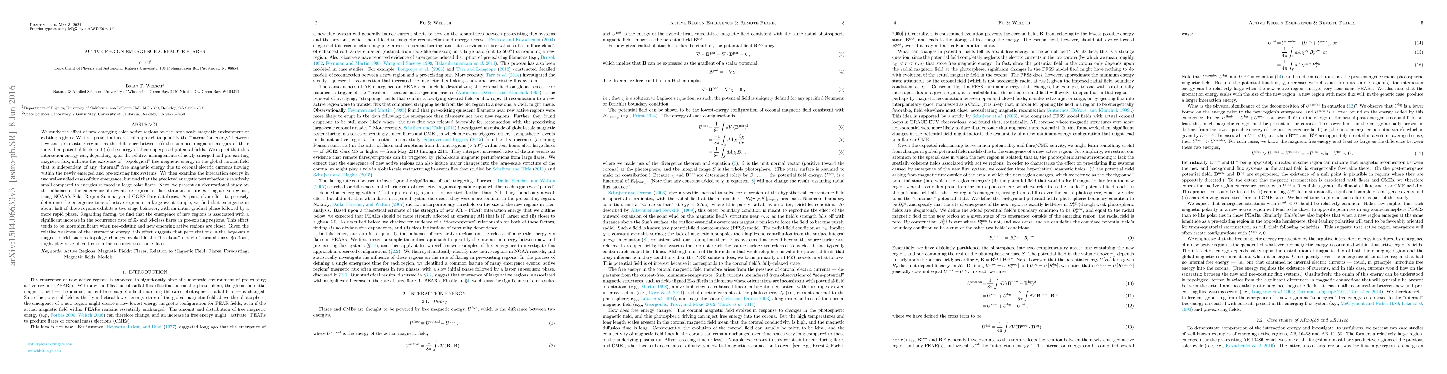 We study the effect of newly emerged solar active regions (ARs) on the large-scale magnetic environment of pre-existing ARs (PEARs). We first present a theoretical approach to quantify the "interaction energy" between new ARs and PEARs as the difference between (i) the summed magnetic energies of their individual potential fields and (ii) the energy of their superposed potential fields. We expect that this interaction energy can, depending upon the relative arrangements of newly emerged and PEAR magnetic flux, indicate the existence of "topological" free magnetic energy in the global coronal field that is independent of any "internal" free magnetic energy due to coronal electric currents flowing within the newly emerged and PEAR flux systems. We then examine the interaction energy in two well-studied cases of flux emergence, but find that the predicted energetic perturbation is relatively small compared to energies released in large solar flares. Next, we present an observational study on the influence of the emergence of new ARs on flare statistics in PEARs, using NOAA's Solar Region Summary and GOES flare databases. As part of an effort to precisely determine the emergence time of ARs in a large event sample, we find that emergence in about half of these regions exhibits a two-stage behavior, with an initial gradual phase followed by a more rapid phase. Regarding flaring, we find that the emergence of new ARs is associated with a significant increase in the occurrence rate of X- and M-class flares in PEARs. This effect tends to be more significant when PEARs and new emerging ARs are closer. Given the relative weakness of the interaction energy, this effect suggests that perturbations in the large-scale magnetic field, such as topology changes invoked in the "breakout" model of coronal mass ejections, might play a significant role in the occurrence of some flares.