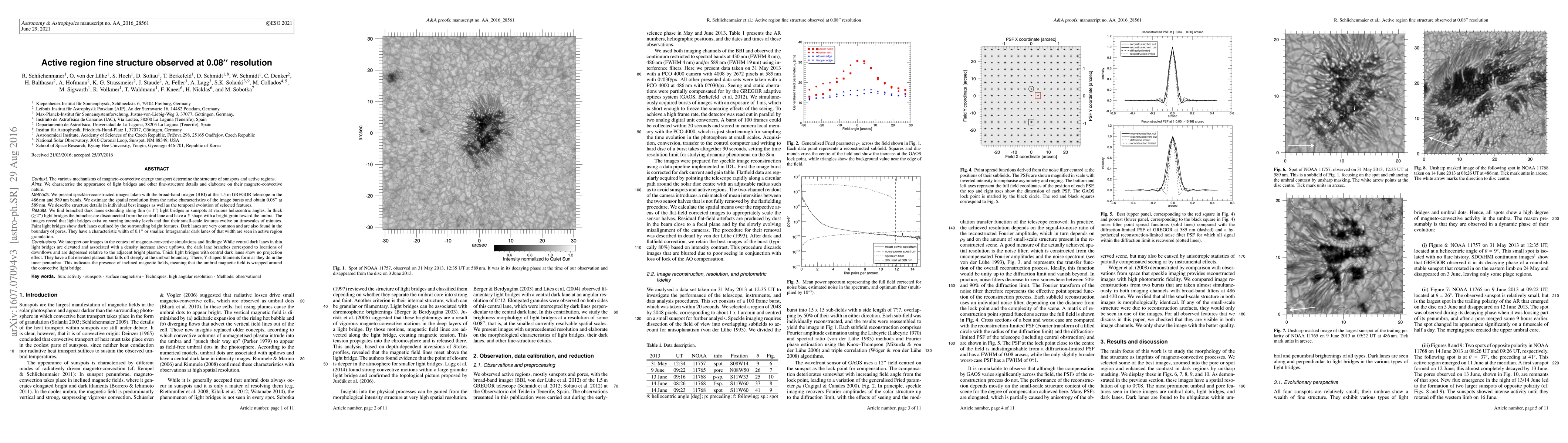 The various mechanisms of magneto-convective energy transport determines the structure of sunspots and active regions. We characterise the appearance of light bridges and other fine-structure details and elaborate on their magneto-convective nature. We present speckle-reconstructed images taken with the broad-band imager at the 1.5 m GREGOR telescope in the 486nm and 589nm bands. We estimate the spatial resolution from the noise characteristics of the image bursts and obtain 0.08" at 589nm. We describe structure details in individual best images as well as the temporal evolution of selected features. We find branched dark lanes extending along thin (~1") light bridges in sunspots at various heliocentric angles. In thick (~2") light bridges the branches are disconnected from the central lane and have a Y shape with a bright grain toward the umbra. The images reveal that light bridges exist on varying intensity levels and that their small-scale features evolve on timescales of minutes. Faint light bridges show dark lanes outlined by the surrounding bright features. Dark lanes are very common and are also found in the boundary of pores. They have a characteristic width of 0.1" or smaller. Intergranular dark lanes of that width are seen in active region granulation. While central dark lanes in thin light bridges are elevated and associated with an density increase above upflows, the dark lane branches correspond to locations of downflows and are depressed relative to the adjacent bright plasma. Thick light bridges with central dark lanes show no projection effect. They have a flat elevated plateau that falls off steeply at the umbral boundary. There, Y-shaped filaments form as they do in the inner penumbra. This indicates the presence of inclined magnetic fields, meaning that the umbral magnetic field is wrapped around the convective light bridge.