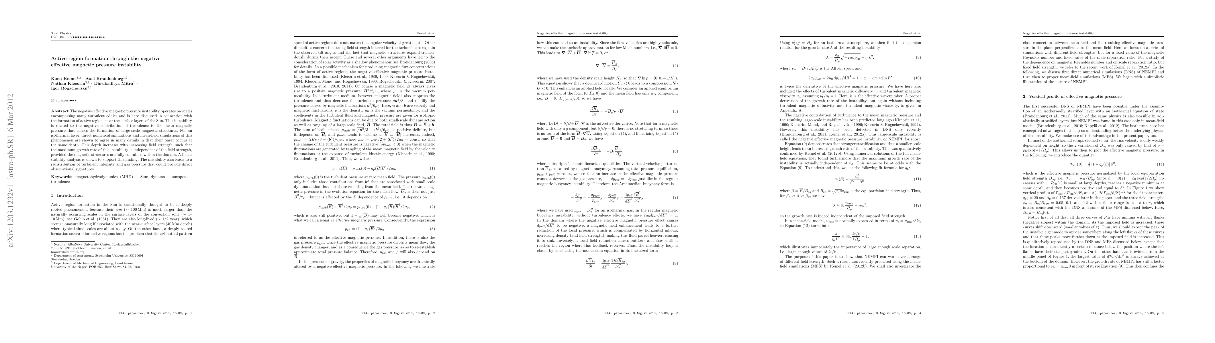 This paper explores the negative effective magnetic pressure instability's role in forming solar active regions near the Sun's surface. Simulations show that this instability, driven by turbulence's negative contribution to mean magnetic pressure, leads to large-scale magnetic structures and redistributes turbulent intensity and gas pressure, offering potential observational signatures.