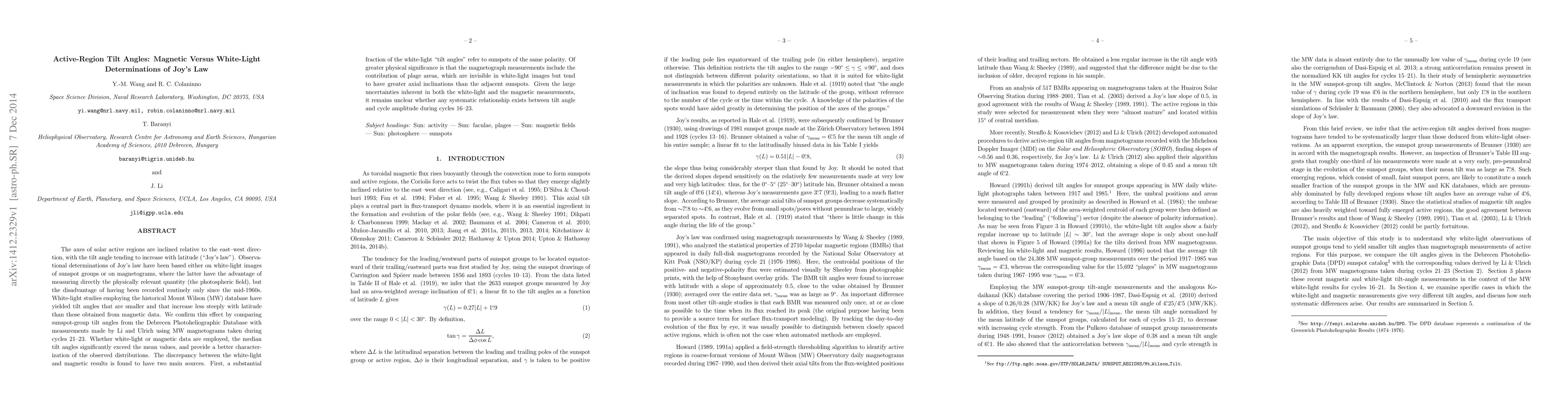 The axes of solar active regions are inclined relative to the east--west direction, with the tilt angle tending to increase with latitude ("Joy's law"). Observational determinations of Joy's law have been based either on white-light images of sunspot groups or on magnetograms, where the latter have the advantage of measuring directly the physically relevant quantity (the photospheric field), but the disadvantage of having been recorded routinely only since the mid-1960s. White-light studies employing the historical Mount Wilson (MW) database have yielded tilt angles that are smaller and that increase less steeply with latitude than those obtained from magnetic data. We confirm this effect by comparing sunspot-group tilt angles from the Debrecen Photoheliographic Database with measurements made by Li and Ulrich using MW magnetograms taken during cycles 21--23. Whether white-light or magnetic data are employed, the median tilt angles significantly exceed the mean values, and provide a better characterization of the observed distributions. The discrepancy between the white-light and magnetic results is found to have two main sources. First, a substantial fraction of the white-light "tilt angles" refer to sunspots of the same polarity. Of greater physical significance is that the magnetograph measurements include the contribution of plage areas, which are invisible in white-light images but tend to have greater axial inclinations than the adjacent sunspots. Given the large uncertainties inherent in both the white-light and the magnetic measurements, it remains unclear whether any systematic relationship exists between tilt angle and cycle amplitude during cycles 16--23.