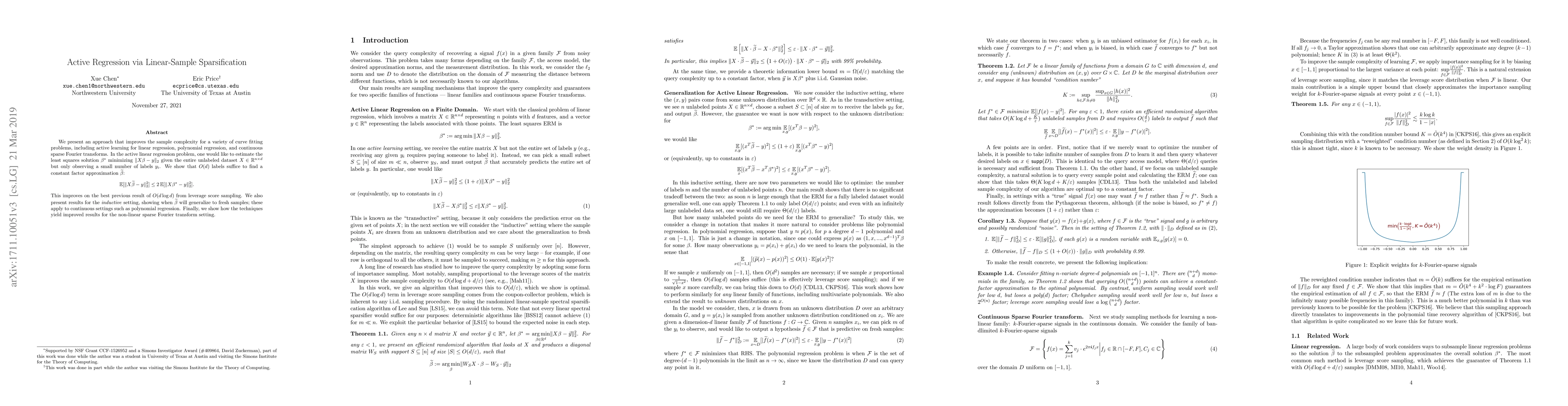 We present an approach that improves the sample complexity for a variety of curve fitting problems, including active learning for linear regression, polynomial regression, and continuous sparse Fourier transforms. In the active linear regression problem, one would like to estimate the least squares solution $\beta^*$ minimizing $\|X\beta - y\|_2$ given the entire unlabeled dataset $X \in \mathbb{R}^{n \times d}$ but only observing a small number of labels $y_i$. We show that $O(d)$ labels suffice to find a constant factor approximation $\tilde{\beta}$: \[ \mathbb{E}[\|X\tilde{\beta} - y\|_2^2] \leq 2 \mathbb{E}[\|X \beta^* - y\|_2^2]. \] This improves on the best previous result of $O(d \log d)$ from leverage score sampling. We also present results for the \emph{inductive} setting, showing when $\tilde{\beta}$ will generalize to fresh samples; these apply to continuous settings such as polynomial regression. Finally, we show how the techniques yield improved results for the non-linear sparse Fourier transform setting.