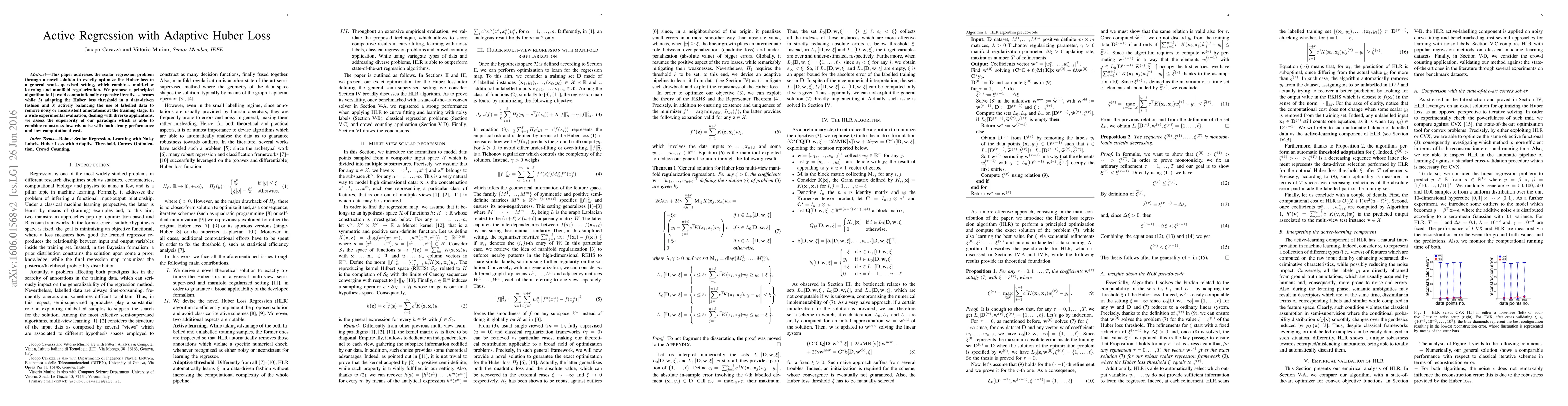The paper proposes an active regression method with adaptive Huber loss, combining multi-view learning and manifold regularization. It optimizes the Huber loss exactly in a semi-supervised setting, avoiding iterative schemes and data-driven threshold adaptation.