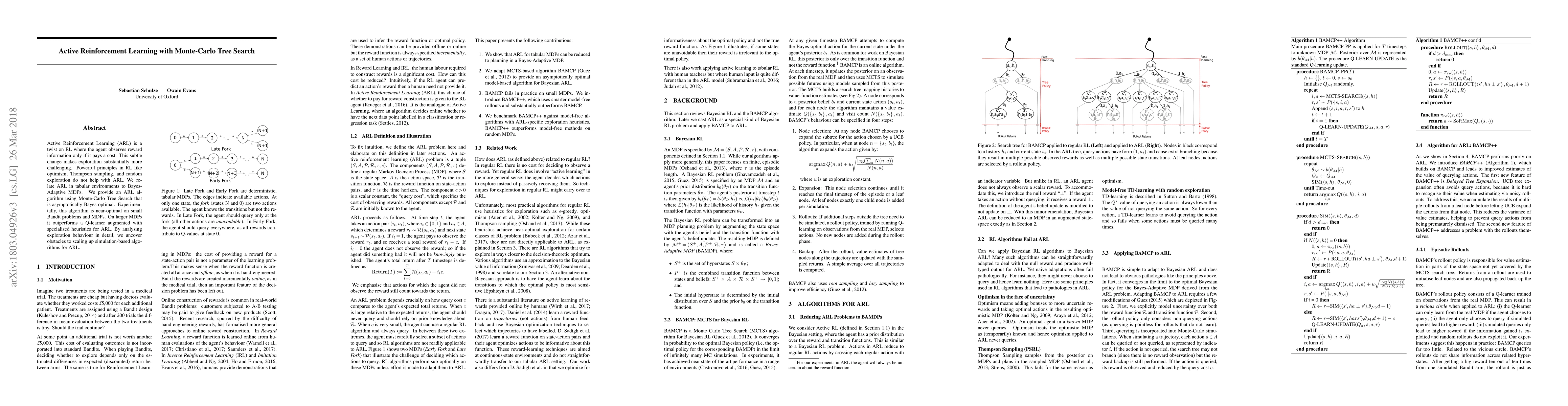 This paper proposes an active Reinforcement Learning (ARL) algorithm using Monte-Carlo Tree Search that is asymptotically Bayes optimal in tabular environments. The algorithm outperforms traditional Q-learning on small problems and larger MDPs, demonstrating the challenges and potential of scaling up simulation-based ARL methods.