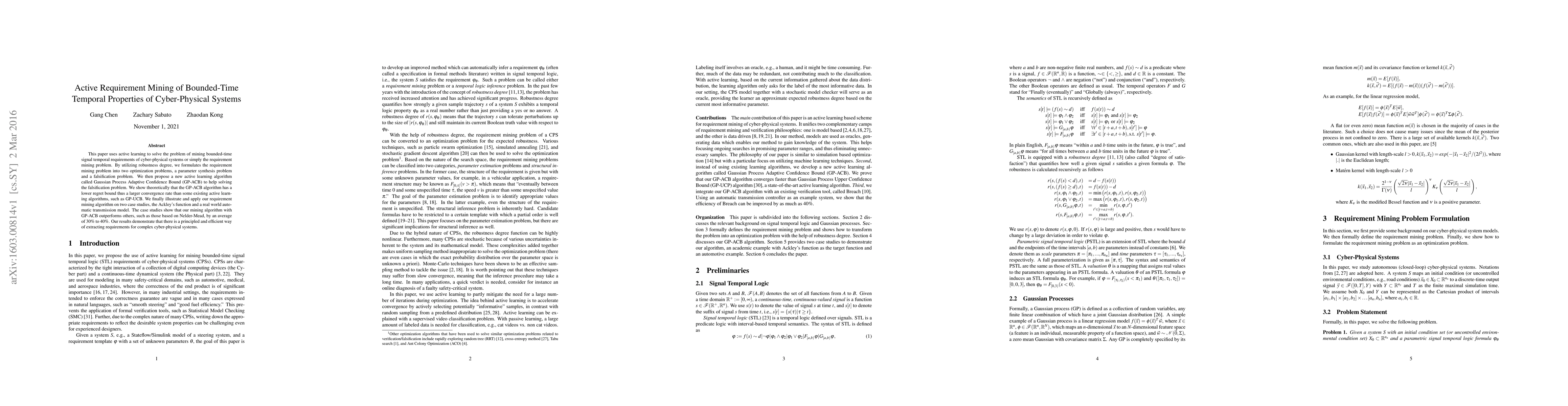 This paper uses active learning to solve the problem of mining bounded-time signal temporal requirements of cyber-physical systems or simply the requirement mining problem. By utilizing robustness degree, we formulates the requirement mining problem into two optimization problems, a parameter synthesis problem and a falsification problem. We then propose a new active learning algorithm called Gaussian Process Adaptive Confidence Bound (GP-ACB) to help solving the falsification problem. We show theoretically that the GP-ACB algorithm has a lower regret bound thus a larger convergence rate than some existing active learning algorithms, such as GP-UCB. We finally illustrate and apply our requirement mining algorithm on two case studies, the Ackley's function and a real world automatic transmission model. The case studies show that our mining algorithm with GP-ACB outperforms others, such as those based on Nelder-Mead, by an average of 30% to 40%. Our results demonstrate that there is a principled and efficient way of extracting requirements for complex cyber-physical systems.