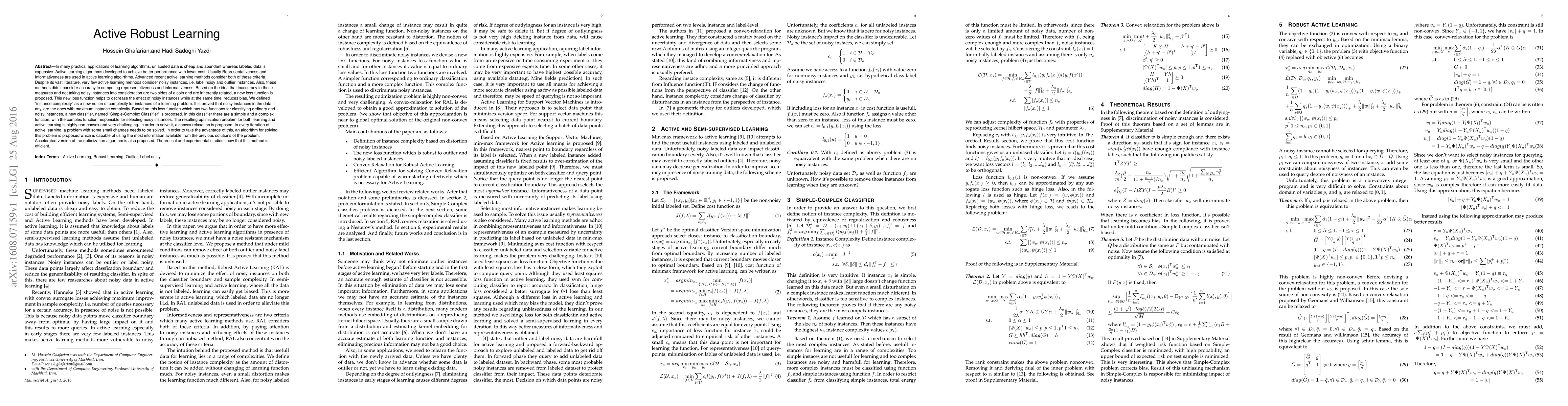 In many practical applications of learning algorithms, unlabeled data is cheap and abundant whereas labeled data is expensive. Active learning algorithms developed to achieve better performance with lower cost. Usually Representativeness and Informativeness are used in active learning algoirthms. Advanced recent active learning methods consider both of these criteria. Despite its vast literature, very few active learning methods consider noisy instances, i.e. label noisy and outlier instances. Also, these methods didn't consider accuracy in computing representativeness and informativeness. Based on the idea that inaccuracy in these measures and not taking noisy instances into consideration are two sides of a coin and are inherently related, a new loss function is proposed. This new loss function helps to decrease the effect of noisy instances while at the same time, reduces bias. We defined "instance complexity" as a new notion of complexity for instances of a learning problem. It is proved that noisy instances in the data if any, are the ones with maximum instance complexity. Based on this loss function which has two functions for classifying ordinary and noisy instances, a new classifier, named "Simple-Complex Classifier" is proposed. In this classifier there are a simple and a complex function, with the complex function responsible for selecting noisy instances. The resulting optimization problem for both learning and active learning is highly non-convex and very challenging. In order to solve it, a convex relaxation is proposed.
