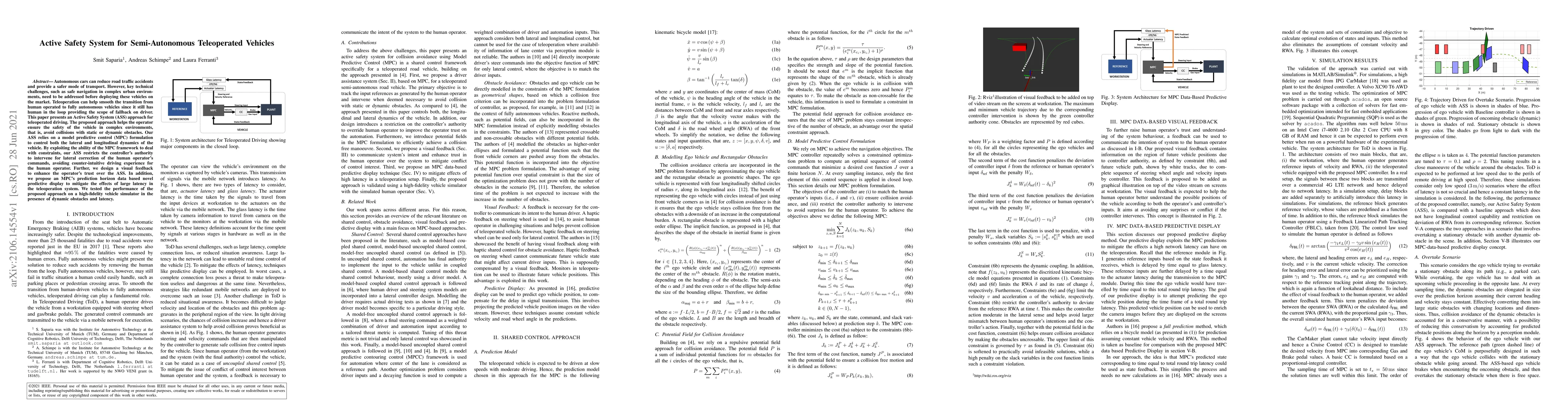 This paper introduces an Active Safety System (ASS) for semi-autonomous teleoperated vehicles, utilizing model predictive control to manage vehicle dynamics while ensuring safe navigation in complex urban environments. The system enhances operator trust through visual feedback and predictive display, addressing latency issues in teleoperation.