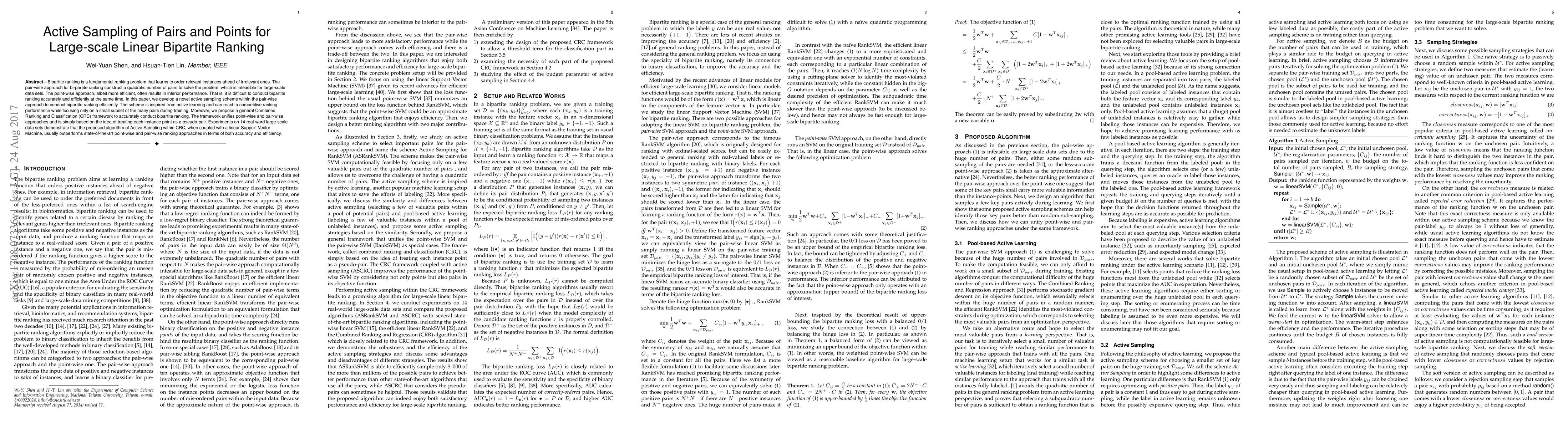 This paper introduces an active sampling scheme for efficient large-scale linear bipartite ranking, combining the pair-wise and point-wise methods into a Combined Ranking and Classification (CRC) framework. Experiments show that the proposed method outperforms existing approaches in both accuracy and efficiency.