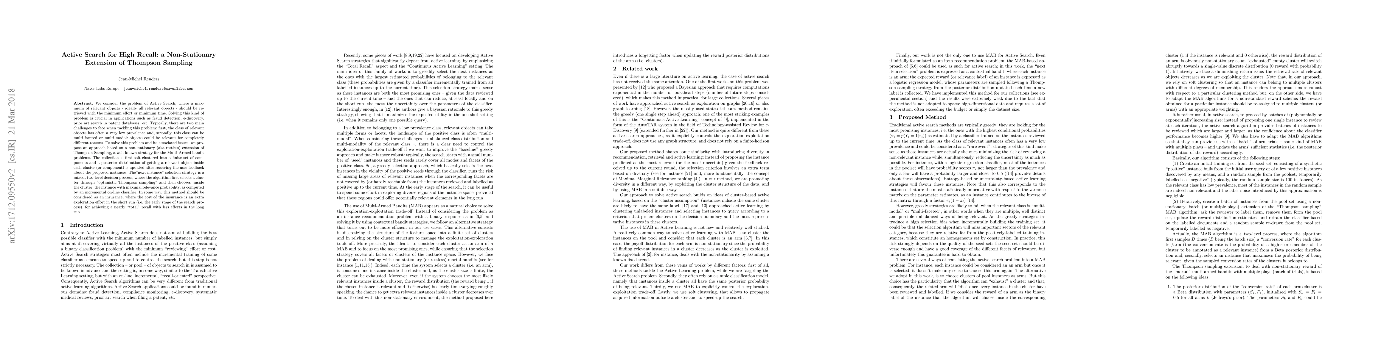 We consider the problem of Active Search, where a maximum of relevant objects - ideally all relevant objects - should be retrieved with the minimum effort or minimum time. Typically, there are two main challenges to face when tackling this problem: first, the class of relevant objects has often low prevalence and, secondly, this class can be multi-faceted or multi-modal: objects could be relevant for completely different reasons. To solve this problem and its associated issues, we propose an approach based on a non-stationary (aka restless) extension of Thompson Sampling, a well-known strategy for Multi-Armed Bandits problems. The collection is first soft-clustered into a finite set of components and a posterior distribution of getting a relevant object inside each cluster is updated after receiving the user feedback about the proposed instances. The "next instance" selection strategy is a mixed, two-level decision process, where both the soft clusters and their instances are considered. This method can be considered as an insurance, where the cost of the insurance is an extra exploration effort in the short run, for achieving a nearly "total" recall with less efforts in the long run.