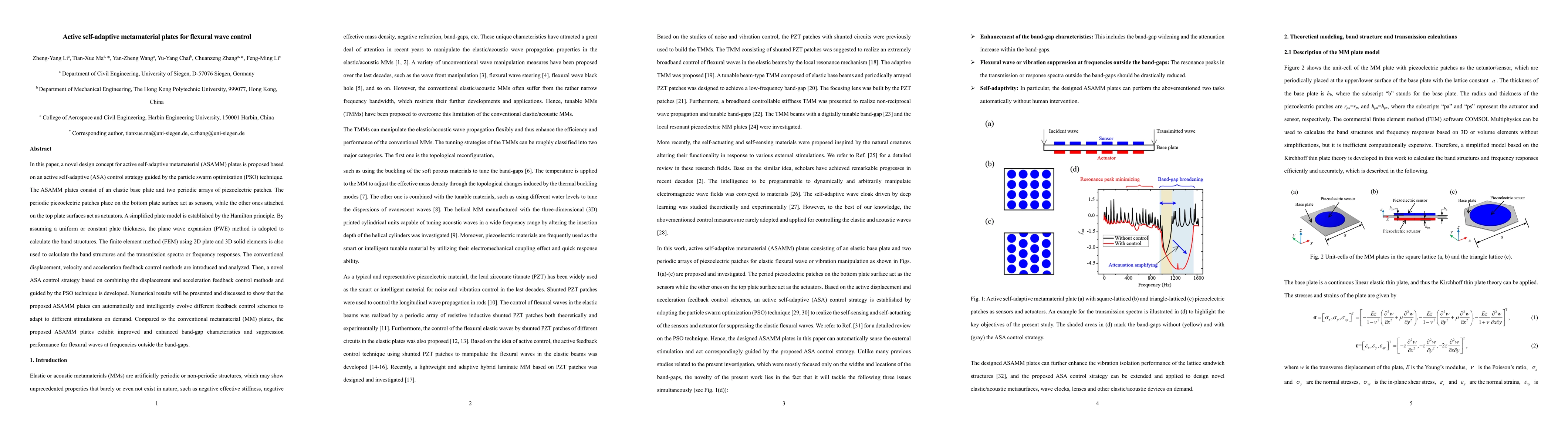 This paper proposes a novel active self-adaptive metamaterial (ASAMM) plate design using an ASA control strategy guided by particle swarm optimization (PSO). The ASAMM plates feature piezoelectric patches for sensing and actuation, and demonstrate enhanced flexural wave control and improved band-gap characteristics compared to conventional metamaterials.
