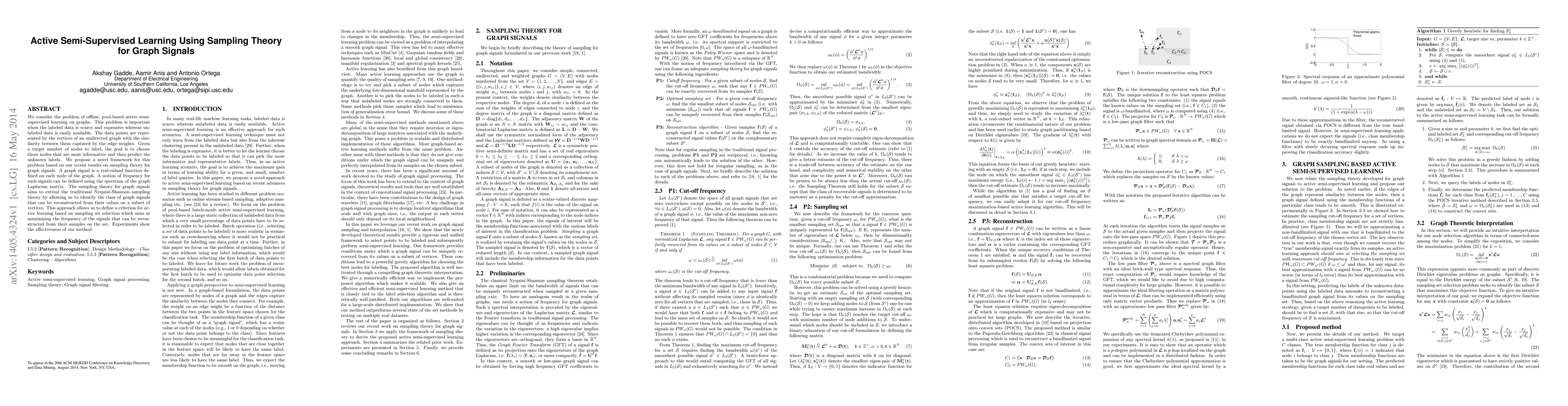 This paper proposes a novel framework for active semi-supervised learning on graphs using sampling theory for graph signals. It aims to identify the most informative nodes to label when labeled data is scarce, leveraging the spectrum of the graph Laplacian matrix to maximize the frequency of reconstructible signals.