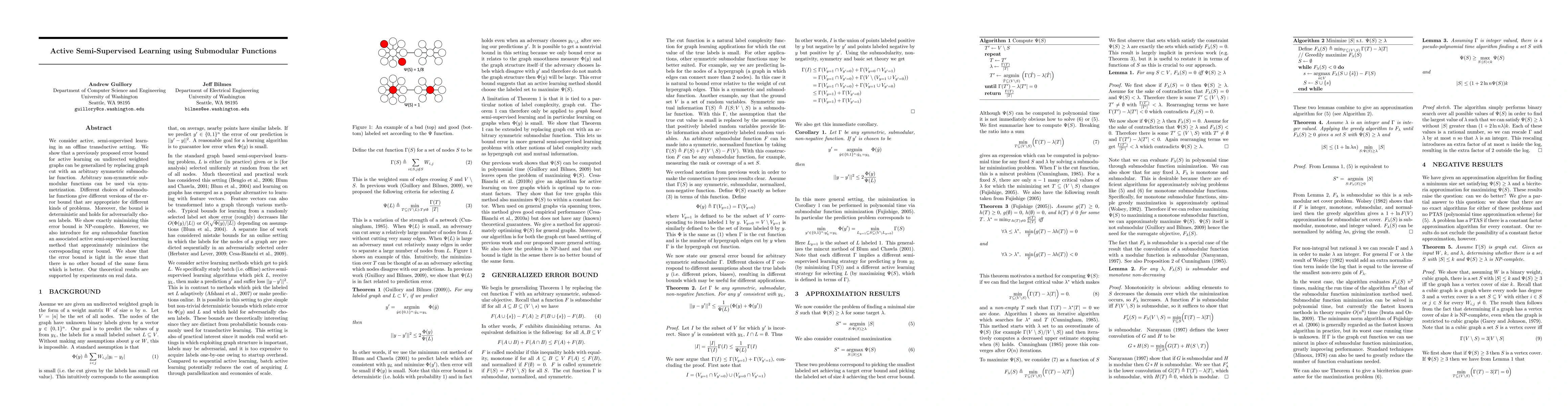 We consider active, semi-supervised learning in an offline transductive setting. We show that a previously proposed error bound for active learning on undirected weighted graphs can be generalized by replacing graph cut with an arbitrary symmetric submodular function. Arbitrary non-symmetric submodular functions can be used via symmetrization. Different choices of submodular functions give different versions of the error bound that are appropriate for different kinds of problems. Moreover, the bound is deterministic and holds for adversarially chosen labels. We show exactly minimizing this error bound is NP-complete. However, we also introduce for any submodular function an associated active semi-supervised learning method that approximately minimizes the corresponding error bound. We show that the error bound is tight in the sense that there is no other bound of the same form which is better. Our theoretical results are supported by experiments on real data.