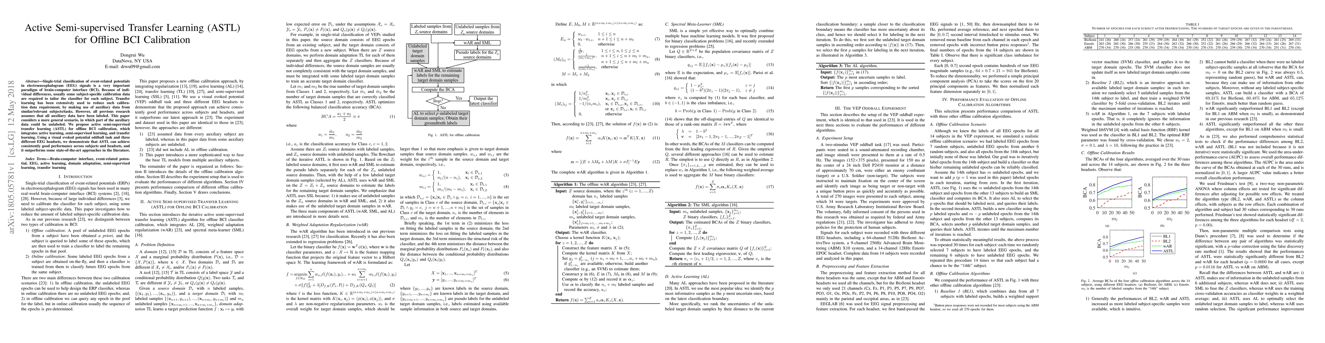 This paper proposes active semi-supervised transfer learning (ASTL) for offline BCI calibration, integrating active learning and semi-supervised learning to utilize both labeled and unlabeled auxiliary data, achieving consistently good performance across subjects and devices. ASTL outperforms existing methods in single-trial classification of EEG signals.