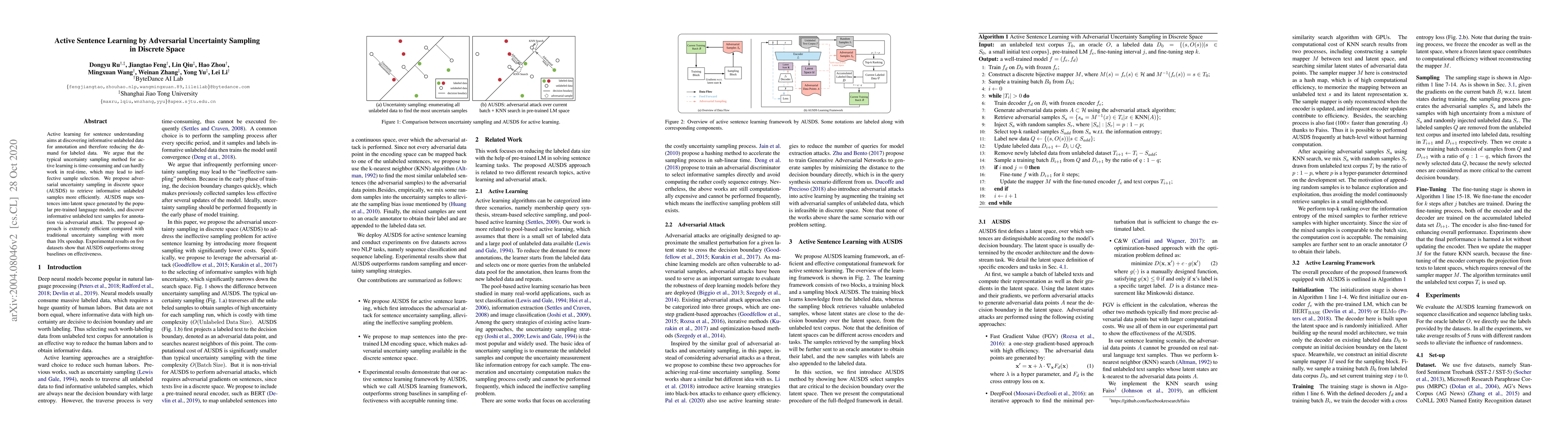 This paper proposes adversarial uncertainty sampling in discrete space (AUSDS) for active learning in sentence understanding, aiming to efficiently select informative unlabeled samples. AUSDS leverages pre-trained language models to map sentences into latent space, using adversarial techniques to identify valuable samples, achieving over 10x speedup compared to traditional methods and outperforming baselines in effectiveness.