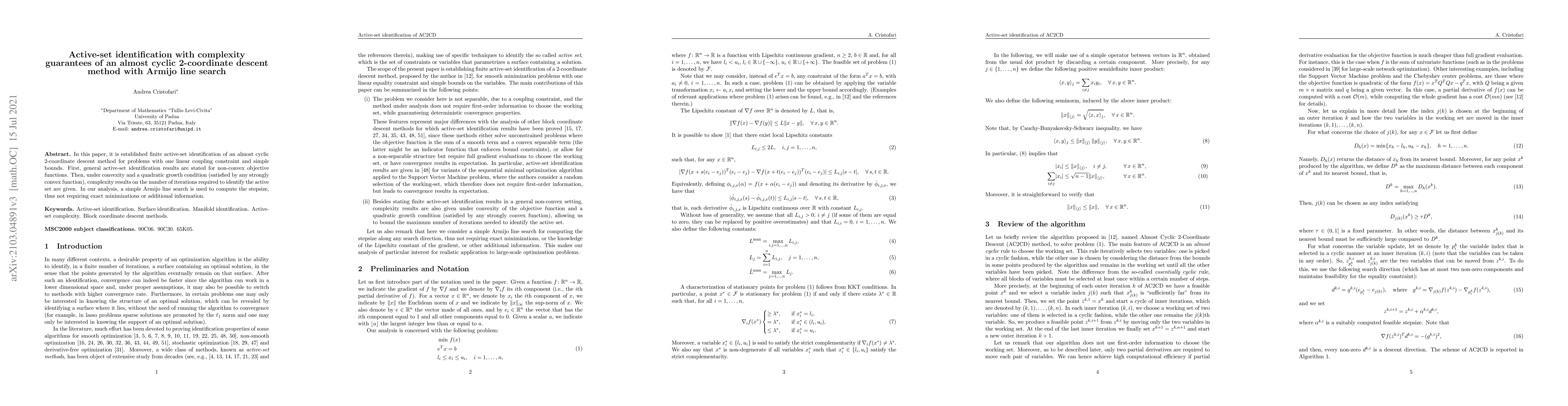 This paper presents a finite active-set identification method using an almost cyclic 2-coordinate descent approach with an Armijo line search for non-convex optimization problems with linear constraints. It provides complexity guarantees on the number of iterations needed to identify the active set, leveraging a quadratic growth condition for strongly convex functions.