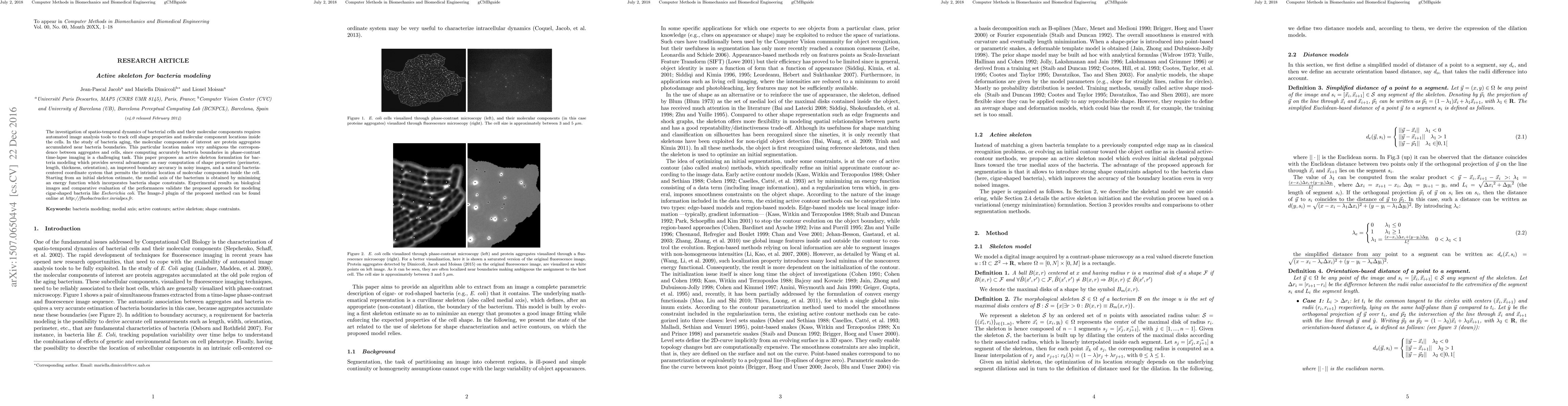 The investigation of spatio-temporal dynamics of bacterial cells and their molecular components requires automated image analysis tools to track cell shape properties and molecular component locations inside the cells. In the study of bacteria aging, the molecular components of interest are protein aggregates accumulated near bacteria boundaries. This particular location makes very ambiguous the correspondence between aggregates and cells, since computing accurately bacteria boundaries in phase-contrast time-lapse imaging is a challenging task. This paper proposes an active skeleton formulation for bacteria modeling which provides several advantages: an easy computation of shape properties (perimeter, length, thickness, orientation), an improved boundary accuracy in noisy images, and a natural bacteria-centered coordinate system that permits the intrinsic location of molecular components inside the cell. Starting from an initial skeleton estimate, the medial axis of the bacterium is obtained by minimizing an energy function which incorporates bacteria shape constraints. Experimental results on biological images and comparative evaluation of the performances validate the proposed approach for modeling cigar-shaped bacteria like Escherichia coli. The Image-J plugin of the proposed method can be found online at http://fluobactracker.inrialpes.fr.