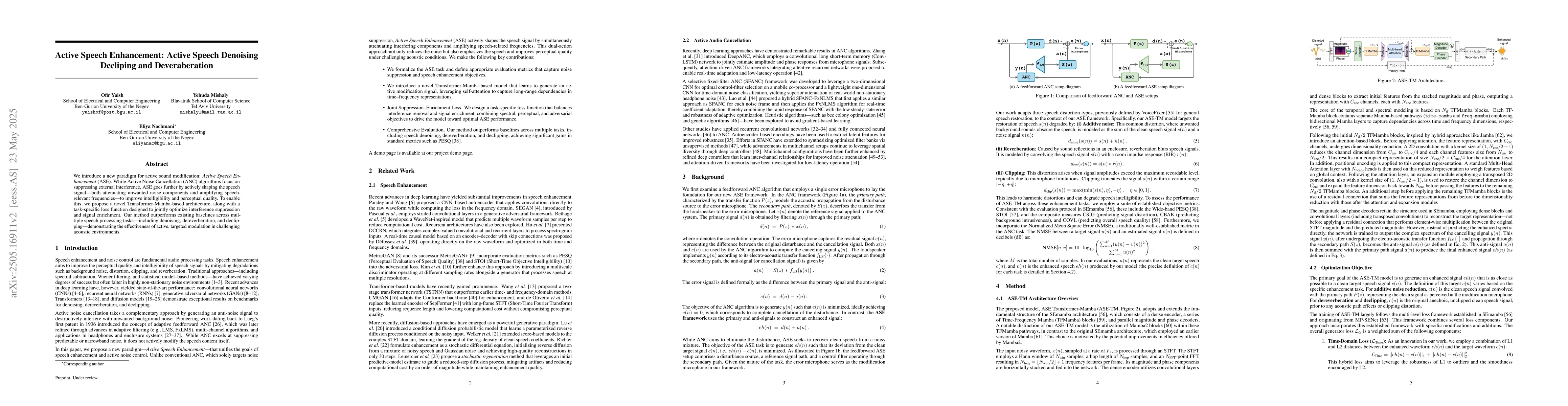 This work stands out by focusing on active speech enhancement rather than mere noise cancellation, utilizing a Transformer-Mamba model, and presenting a unified approach for multiple speech processing tasks.
