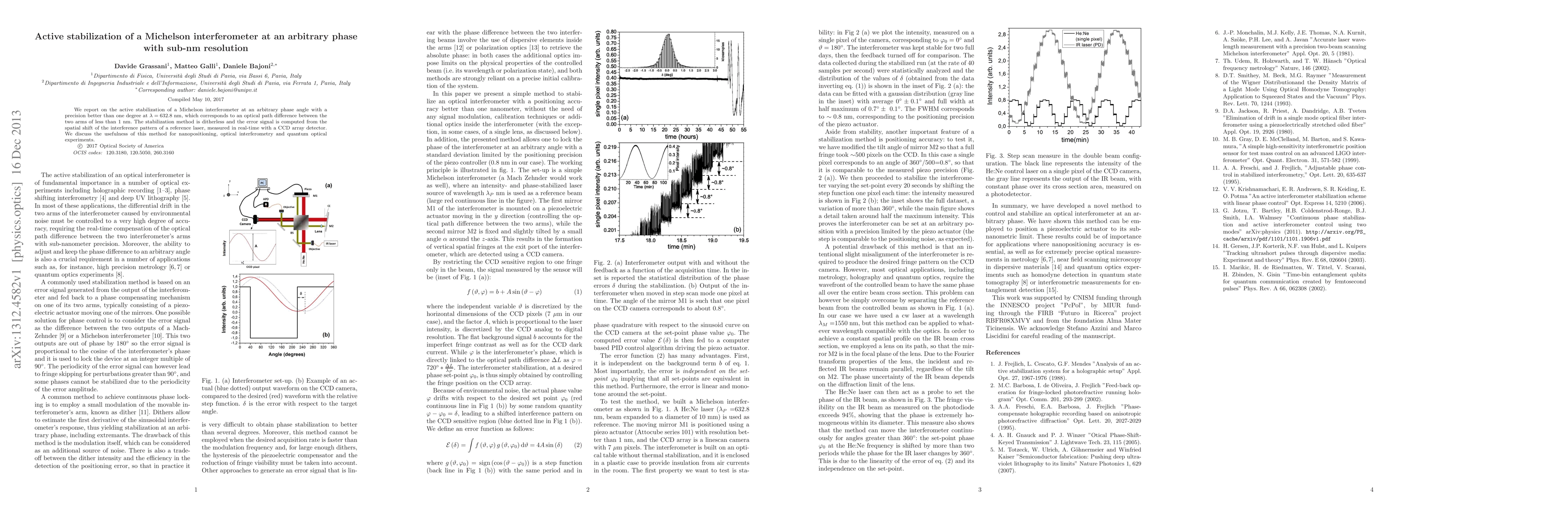 We report on the active stabilization of a Michelson interferometer at an arbitrary phase angle with a precision better than one degree at $\lambda = 632.8$ nm, which corresponds to an optical path difference between the two arms of less than 1 nm. The stabilization method is ditherless and the error signal is computed from the spatial shift of the interference pattern of a reference laser, measured in real-time with a CCD array detector. We discuss the usefulness of this method for nanopositioning, optical interferometry and quantum optical experiments.