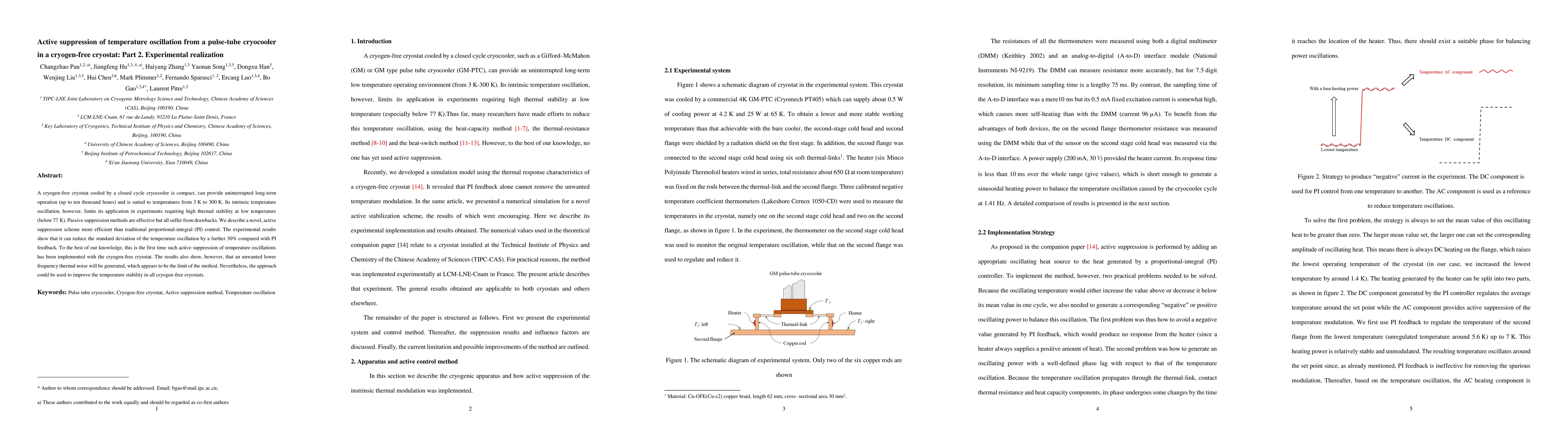 The paper presents an innovative active suppression method for temperature oscillations in cryogen-free cryostats, reducing standard deviation by 30% more than traditional PI control. This approach, though introducing a lower frequency thermal noise, marks the first implementation of active temperature oscillation suppression in cryogen-free cryostats, potentially enhancing temperature stability across all such systems.