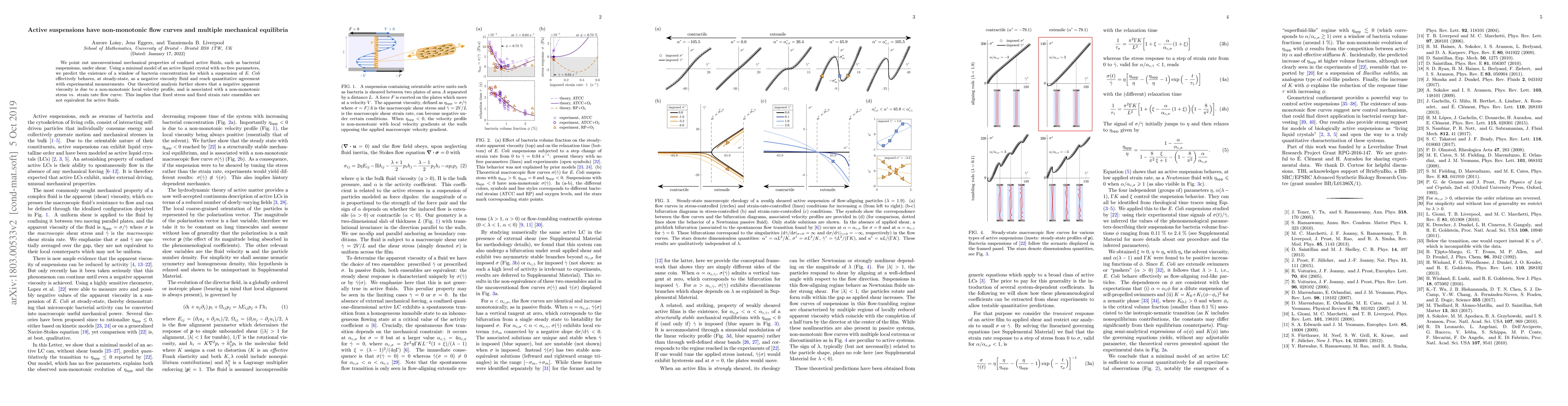 This research reveals that active suspensions, like bacterial fluids, exhibit non-monotonic flow curves and multiple mechanical equilibria under shear. The study predicts a concentration range where the suspension behaves as a negative viscosity fluid, supported by theoretical analysis and experimental validation.