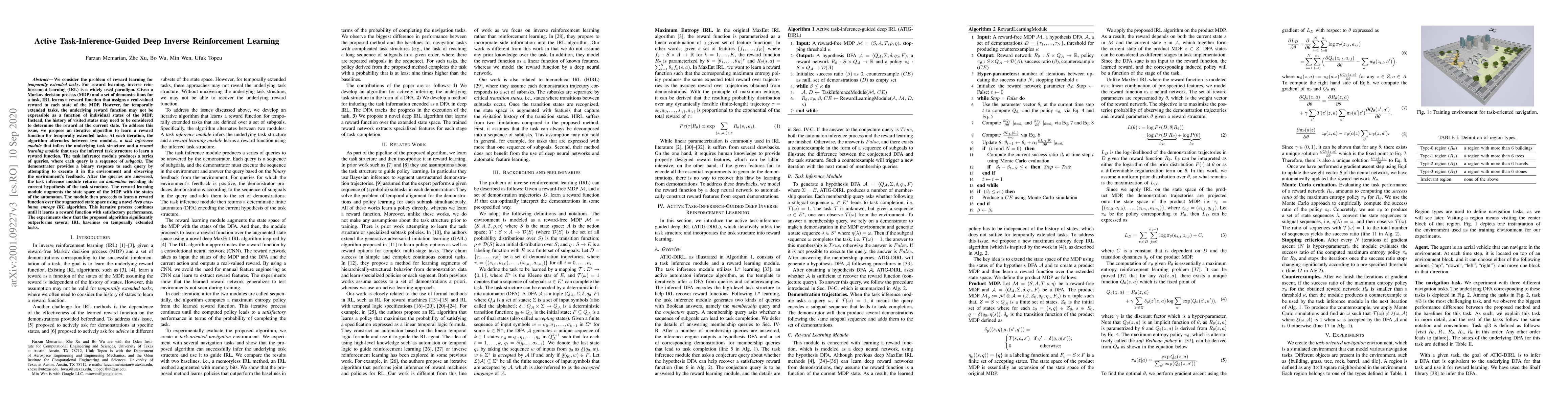 This paper proposes an iterative algorithm to learn a reward function for temporally extended tasks through active task-inference-guided deep inverse reinforcement learning, outperforming several IRL baselines in experiments.