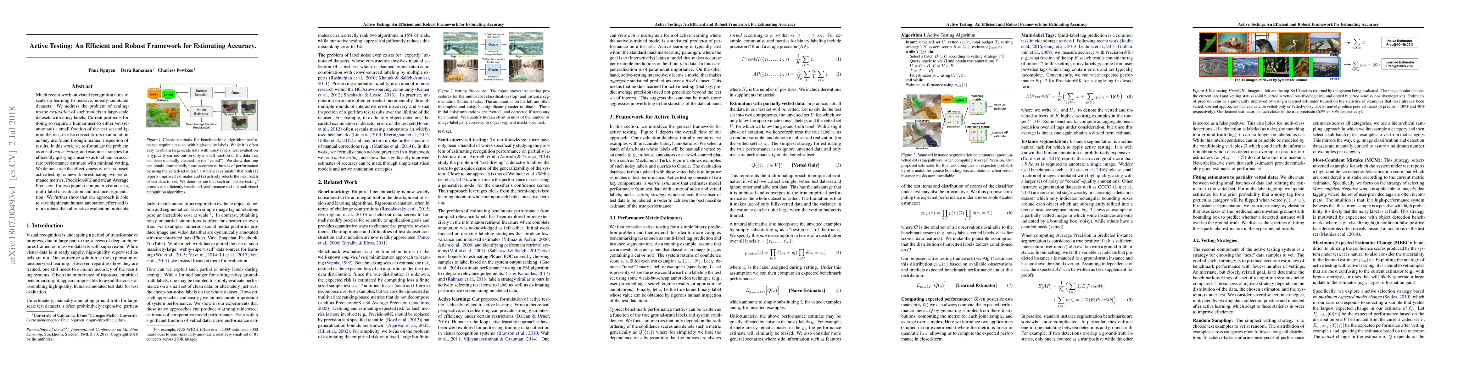 Much recent work on visual recognition aims to scale up learning to massive, noisily-annotated datasets. We address the problem of scaling- up the evaluation of such models to large-scale datasets with noisy labels. Current protocols for doing so require a human user to either vet (re-annotate) a small fraction of the test set and ignore the rest, or else correct errors in annotation as they are found through manual inspection of results. In this work, we re-formulate the problem as one of active testing, and examine strategies for efficiently querying a user so as to obtain an accu- rate performance estimate with minimal vetting. We demonstrate the effectiveness of our proposed active testing framework on estimating two performance metrics, Precision@K and mean Average Precision, for two popular computer vision tasks, multi-label classification and instance segmentation. We further show that our approach is able to save significant human annotation effort and is more robust than alternative evaluation protocols.