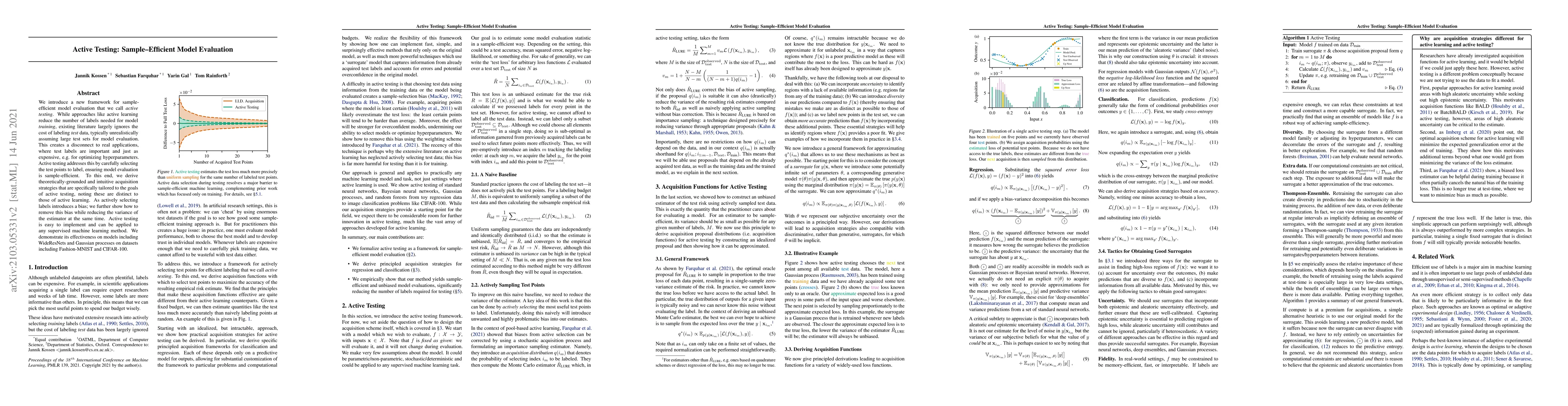 This paper proposes "active testing," a framework for sample-efficient model evaluation that strategically selects test data labels to minimize costs while maintaining accuracy. It introduces acquisition strategies tailored for active testing, addressing the bias introduced by selective labeling and demonstrating effectiveness across various models and datasets.