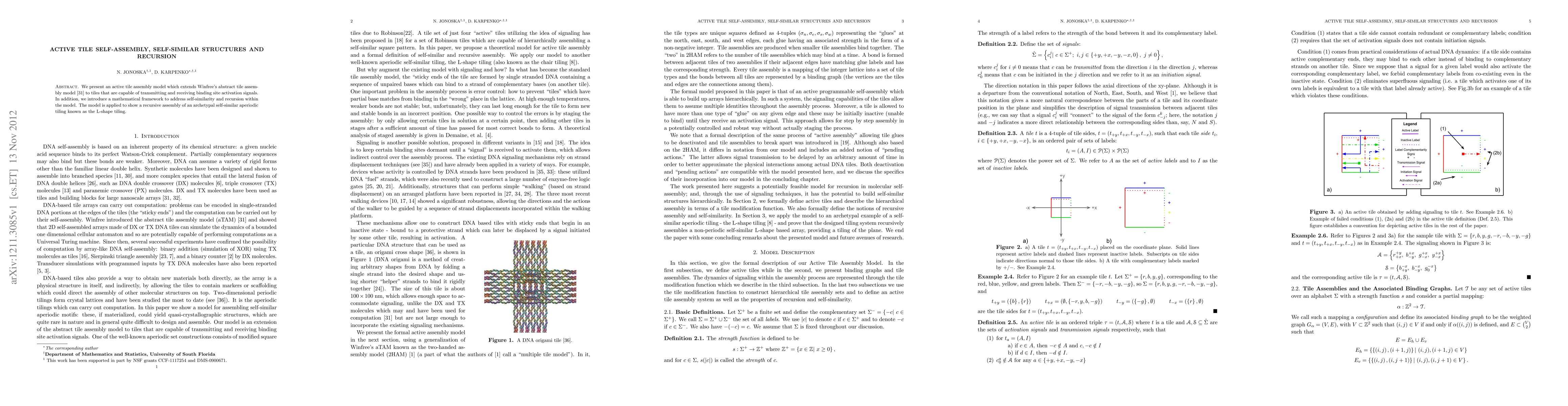 This paper extends Winfree's abstract tile assembly model to include active tiles that can transmit and receive activation signals, introducing a framework for self-similarity and recursion. It demonstrates the model's capability by recursively assembling an archetypal self-similar aperiodic tiling, the L-shape tiling.