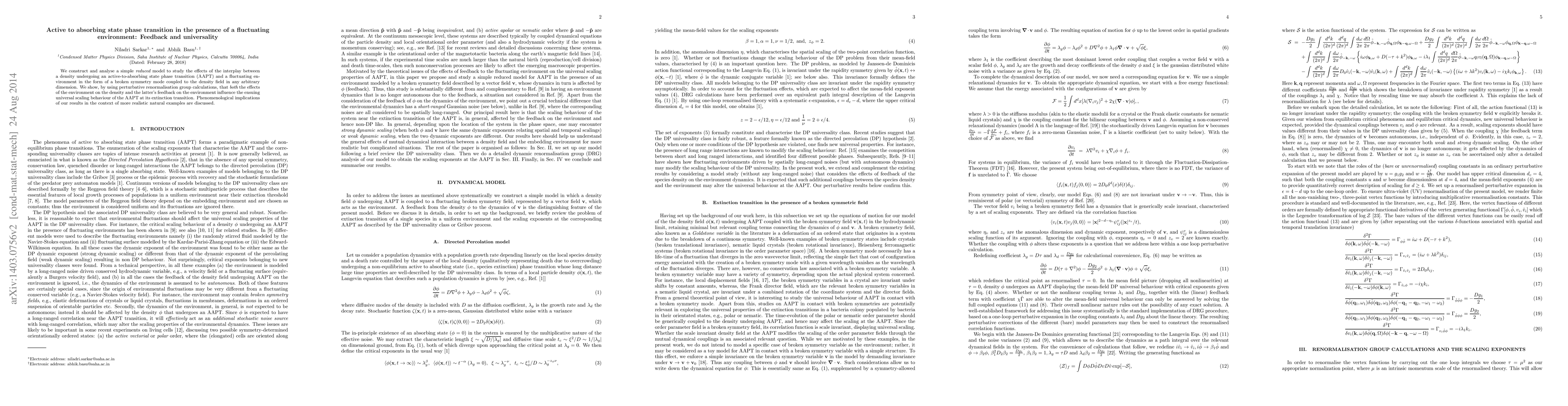 We construct and analyse a simple {\em reduced} model to study the effects of the interplay between a density undergoing an active-to-absorbing state phase transition (AAPT) and a fluctuating environment in the form of a broken symmetry mode coupled to the density field in any arbitrary dimension. We show, by using perturbative renormalisation group calculations, that {\em both} the effects of the environment on the density and the latter's feedback on the environment influence the ensuing universal scaling behaviour of the AAPT at its extinction transition. Phenomenological implications of our results in the context of more realistic natural examples are discussed.