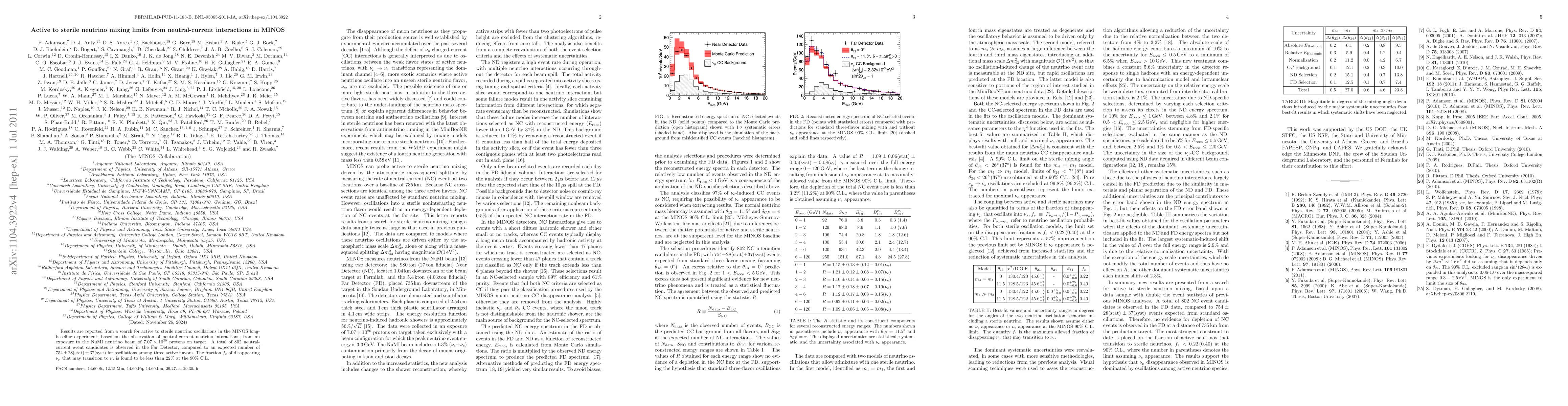 The MINOS experiment sets limits on active to sterile neutrino mixing by analyzing neutral-current interactions, finding less than 22% of muon neutrinos may transition to sterile neutrinos at 90% confidence level. The study observed 802 neutral-current events in the Far Detector, consistent with three-flavor oscillations.