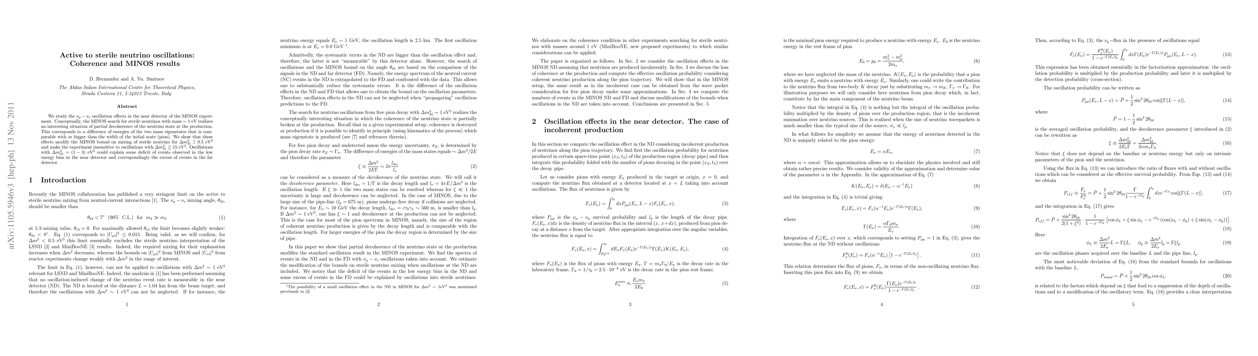 We study the $\nu_\mu - \nu_s$ oscillation effects in the near detector of the MINOS experiment. Conceptually, the MINOS search for sterile neutrinos with mass $\sim 1$ eV realizes an interesting situation of partial decoherence of the neutrino state at the production. This corresponds to a difference of energies of the two mass eigenstates that is comparable with or bigger than the width of the initial state (pion). We show that these effects modify the MINOS bound on mixing of sterile neutrino for $\Delta m^2_{41} \aprge 0.5$ eV$^2$ and make the experiment insensitive to oscillations with $\Delta m^2_{41} \gtrsim 15$ eV$^2$. Oscillations with $\Delta m^2_{41} = (1 - 3)$ eV$^2$ could explain some deficit of events observed in the low energy bins in the near detector and correspondingly the excess of events in the far detector.