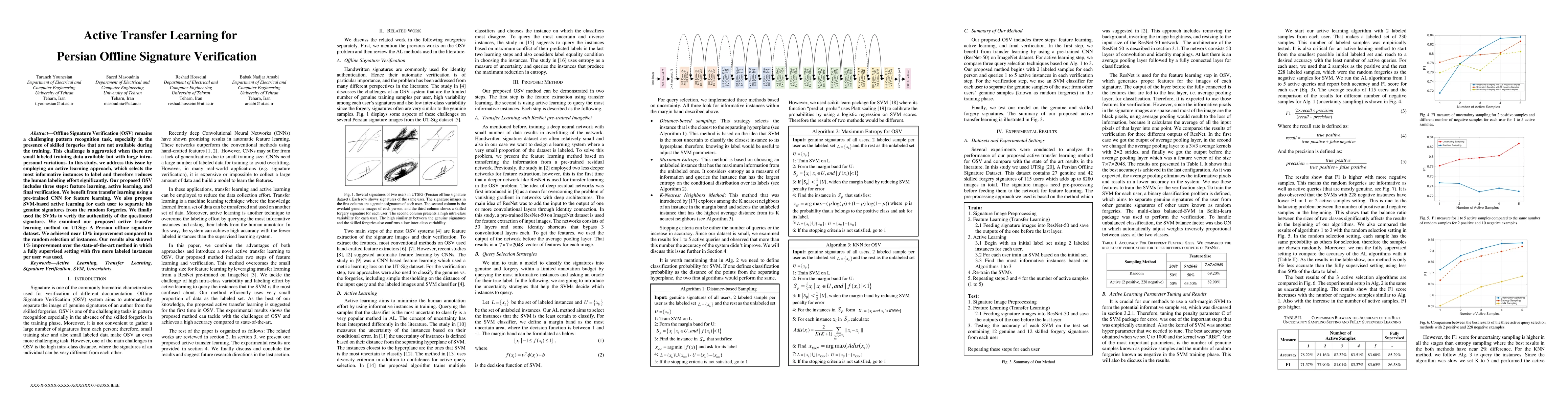 This paper proposes an active transfer learning method for Persian offline signature verification, utilizing a pre-trained CNN for feature learning and SVM-based active learning to select the most informative instances, achieving a 13% improvement over random selection and a 1% improvement over state-of-the-art methods.