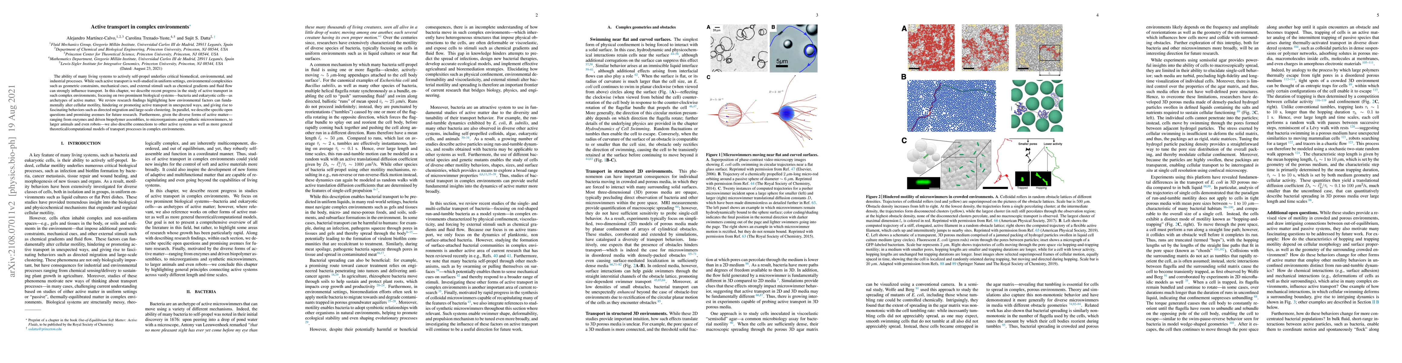 This paper reviews recent advancements in understanding active transport in complex environments, focusing on bacteria and eukaryotic cells. It highlights how environmental factors like geometric constraints and chemical gradients influence cellular motility, leading to behaviors like directed migration and clustering. The paper also discusses connections to other active systems and outlines future research directions.