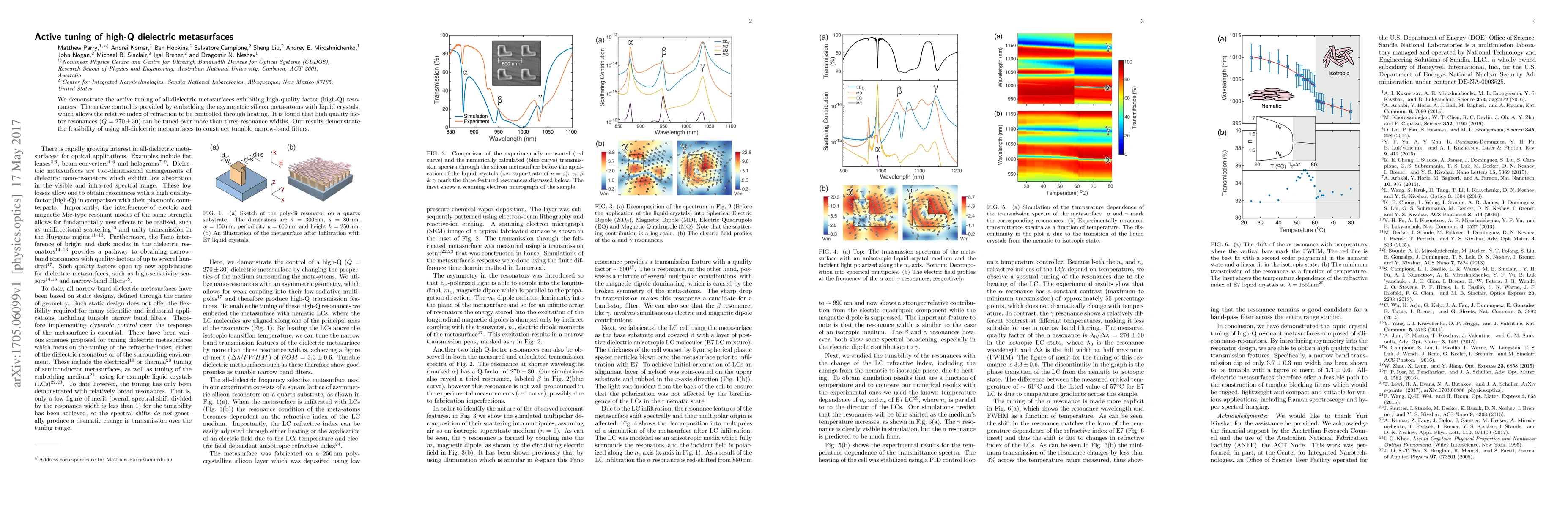 The paper presents a method for actively tuning high-Q dielectric metasurfaces by embedding silicon meta-atoms with liquid crystals, achieving control over the relative index of refraction via heating, and demonstrating tuning over more than three resonance widths. The potential for constructing tunable narrow-band filters with all-dielectric metasurfaces is highlighted.