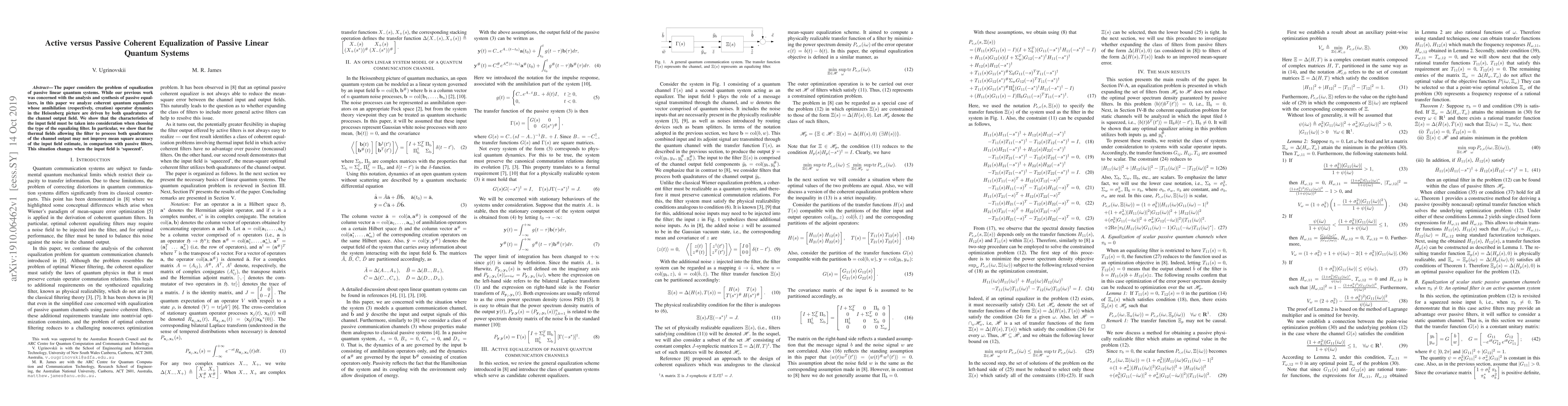 This paper investigates the performance of active versus passive coherent quantum equalizers in passive linear quantum systems. It finds that while active equalizers can improve estimation accuracy for squeezed input fields, they do not necessarily outperform passive filters for thermal fields.