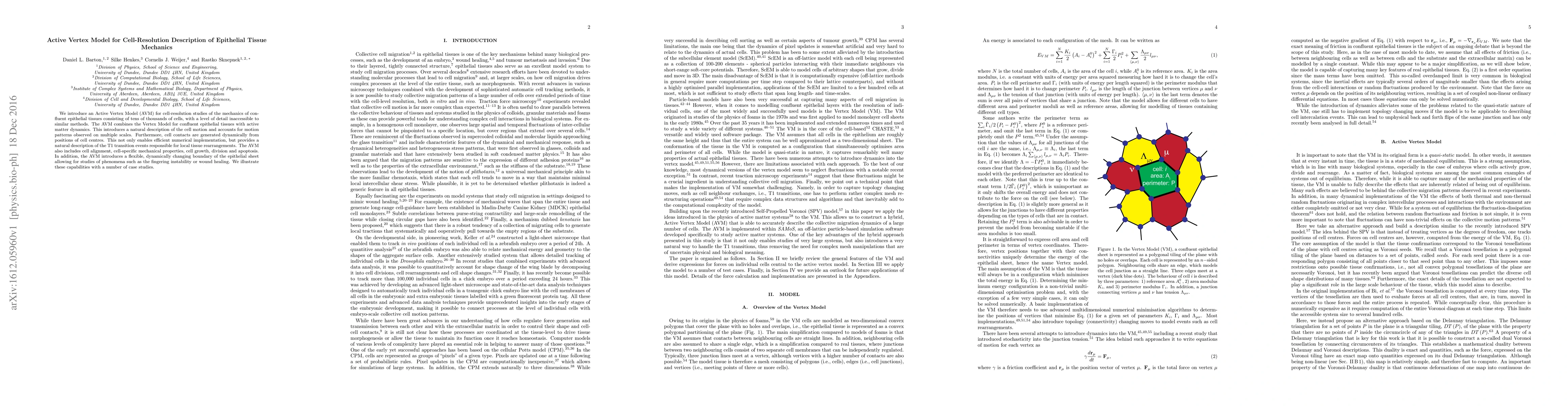 The Active Vertex Model (AVM) offers a detailed, cell-resolution framework for studying the mechanics of confluent epithelial tissues, combining vertex modeling with active matter dynamics to simulate cell motion, growth, division, and apoptosis, and providing insights into tissue rearrangements and wound healing. The model dynamically generates cell contacts and a flexible epithelial boundary, enabling efficient numerical simulations and multi-scale observations.