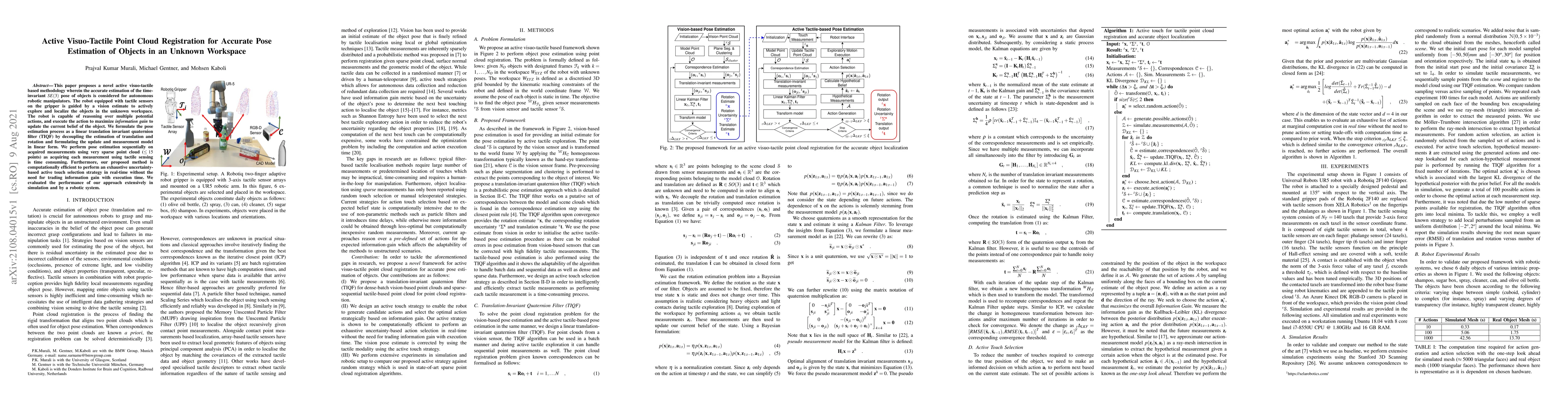 This paper proposes a novel active visuo-tactile based methodology wherein the accurate estimation of the time-invariant SE(3) pose of objects is considered for autonomous robotic manipulators. The robot equipped with tactile sensors on the gripper is guided by a vision estimate to actively explore and localize the objects in the unknown workspace. The robot is capable of reasoning over multiple potential actions, and execute the action to maximize information gain to update the current belief of the object. We formulate the pose estimation process as a linear translation invariant quaternion filter (TIQF) by decoupling the estimation of translation and rotation and formulating the update and measurement model in linear form. We perform pose estimation sequentially on acquired measurements using very sparse point cloud as acquiring each measurement using tactile sensing is time consuming. Furthermore, our proposed method is computationally efficient to perform an exhaustive uncertainty-based active touch selection strategy in real-time without the need for trading information gain with execution time. We evaluated the performance of our approach extensively in simulation and by a robotic system.