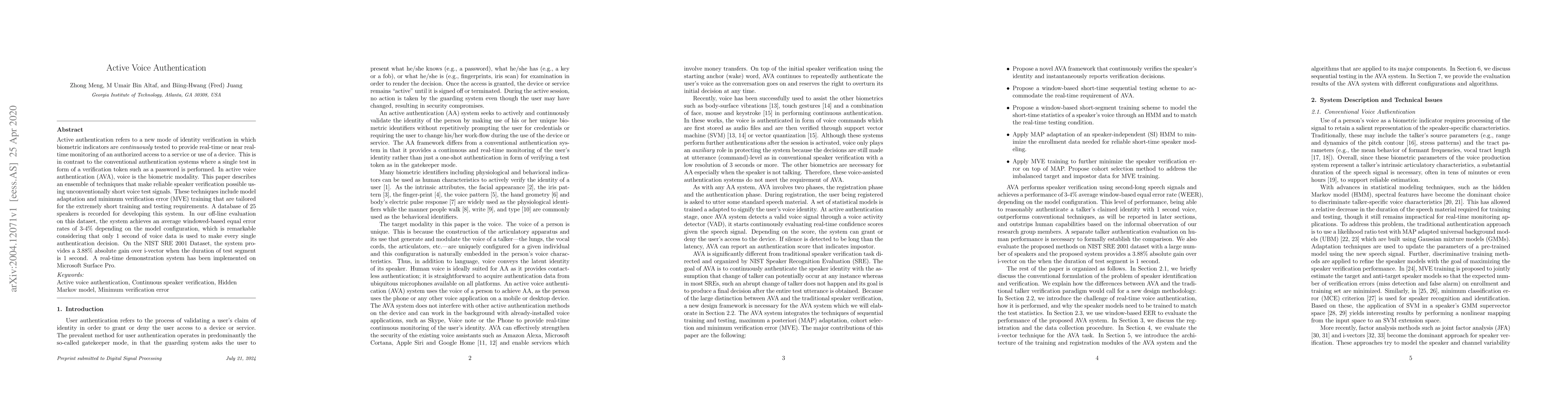 This paper introduces active voice authentication (AVA) using ensemble techniques for reliable speaker verification with short voice signals, achieving 3-4% equal error rates on a custom dataset and a 3.88% gain over i-vector on the NIST SRE 2001 Dataset with 1-second voice data. A real-time demo is implemented on Microsoft Surface Pro.