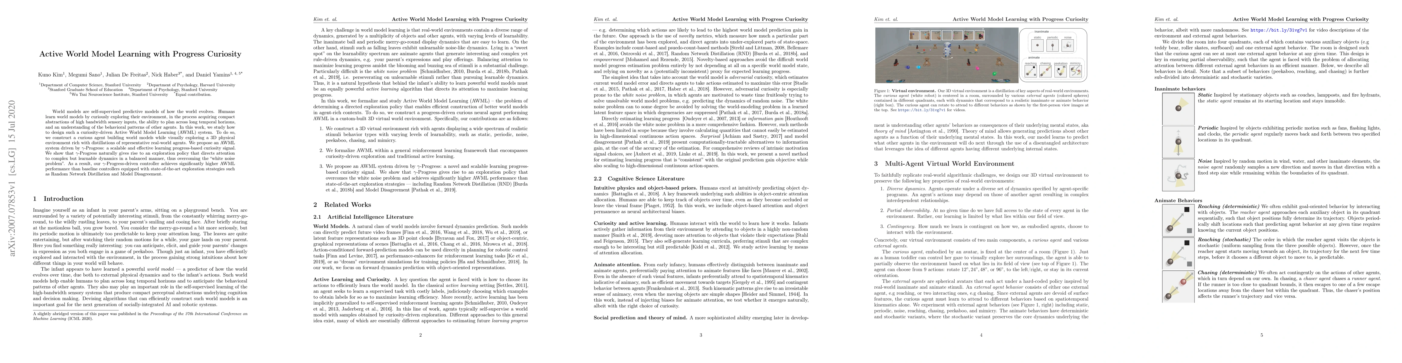 World models are self-supervised predictive models of how the world evolves. Humans learn world models by curiously exploring their environment, in the process acquiring compact abstractions of high bandwidth sensory inputs, the ability to plan across long temporal horizons, and an understanding of the behavioral patterns of other agents. In this work, we study how to design such a curiosity-driven Active World Model Learning (AWML) system. To do so, we construct a curious agent building world models while visually exploring a 3D physical environment rich with distillations of representative real-world agents. We propose an AWML system driven by $\gamma$-Progress: a scalable and effective learning progress-based curiosity signal. We show that $\gamma$-Progress naturally gives rise to an exploration policy that directs attention to complex but learnable dynamics in a balanced manner, thus overcoming the "white noise problem". As a result, our $\gamma$-Progress-driven controller achieves significantly higher AWML performance than baseline controllers equipped with state-of-the-art exploration strategies such as Random Network Distillation and Model Disagreement.