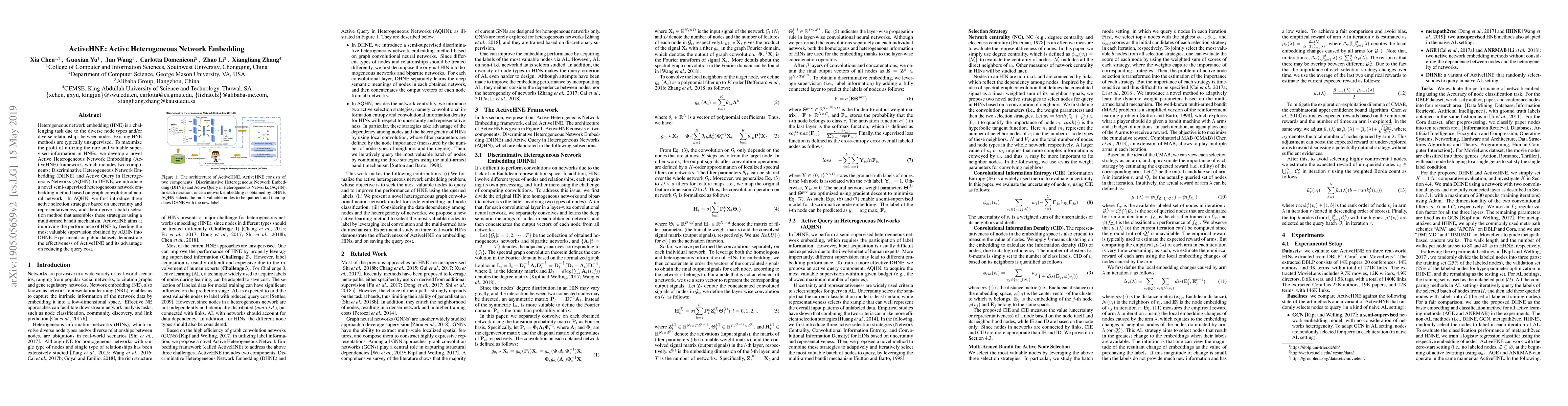 The ActiveHNE framework introduces a semi-supervised method for heterogeneous network embedding, combining discriminative embedding and active query strategies to leverage valuable supervised information and reduce query costs. Experiments show its effectiveness in improving embedding performance.