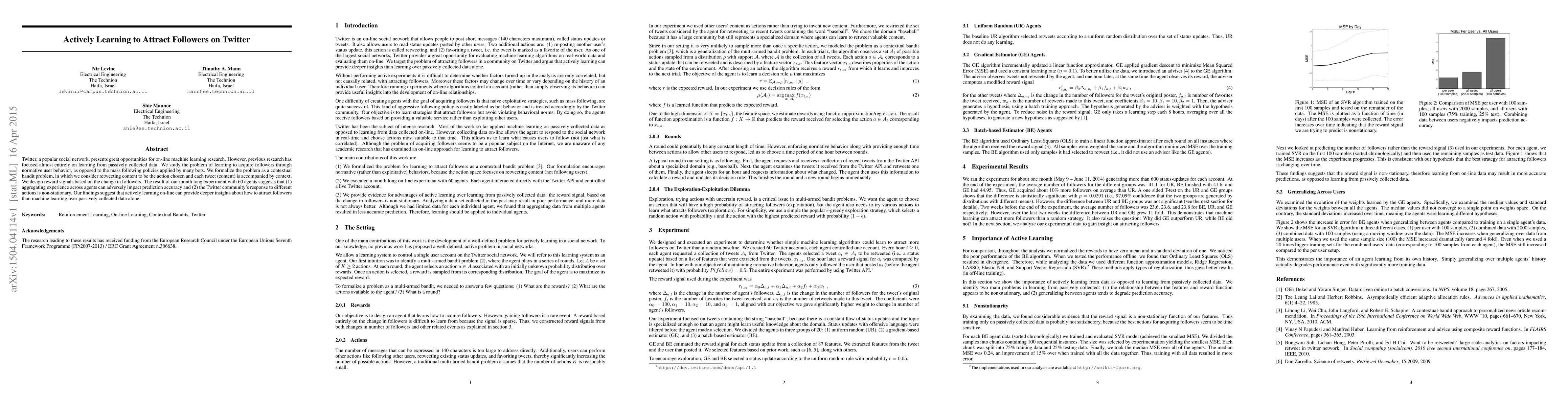 Twitter, a popular social network, presents great opportunities for on-line machine learning research. However, previous research has focused almost entirely on learning from passively collected data. We study the problem of learning to acquire followers through normative user behavior, as opposed to the mass following policies applied by many bots. We formalize the problem as a contextual bandit problem, in which we consider retweeting content to be the action chosen and each tweet (content) is accompanied by context. We design reward signals based on the change in followers. The result of our month long experiment with 60 agents suggests that (1) aggregating experience across agents can adversely impact prediction accuracy and (2) the Twitter community's response to different actions is non-stationary. Our findings suggest that actively learning on-line can provide deeper insights about how to attract followers than machine learning over passively collected data alone.