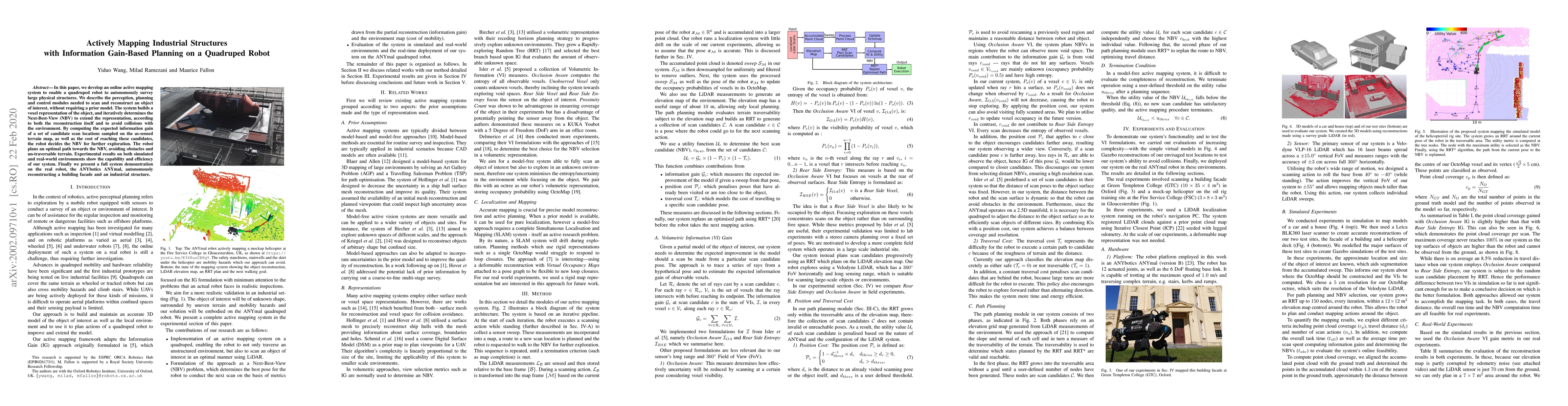 In this paper, we develop an online active mapping system to enable a quadruped robot to autonomously survey large physical structures. We describe the perception, planning and control modules needed to scan and reconstruct an object of interest, without requiring a prior model. The system builds a voxel representation of the object, and iteratively determines the Next-Best-View (NBV) to extend the representation, according to both the reconstruction itself and to avoid collisions with the environment. By computing the expected information gain of a set of candidate scan locations sampled on the as-sensed terrain map, as well as the cost of reaching these candidates, the robot decides the NBV for further exploration. The robot plans an optimal path towards the NBV, avoiding obstacles and un-traversable terrain. Experimental results on both simulated and real-world environments show the capability and efficiency of our system. Finally we present a full system demonstration on the real robot, the ANYbotics ANYmal, autonomously reconstructing a building facade and an industrial structure.