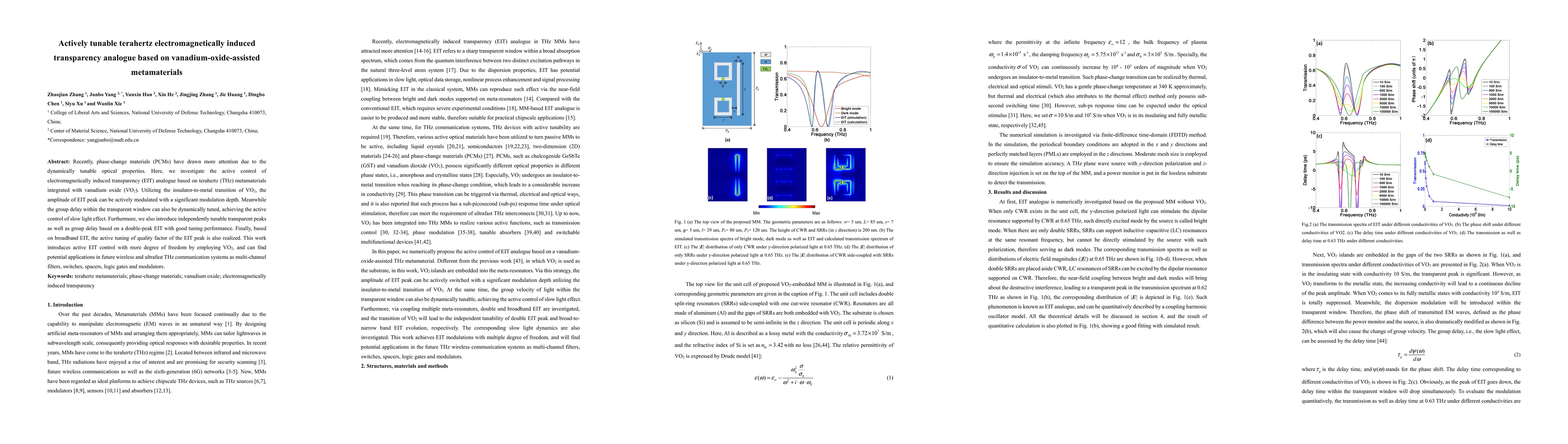 This paper explores actively tunable terahertz electromagnetically induced transparency (EIT) analogues using vanadium oxide-assisted metamaterials, leveraging VO2's insulator-to-metal transition for dynamic modulation of EIT peaks and group delay, with potential applications in advanced THz communication systems.