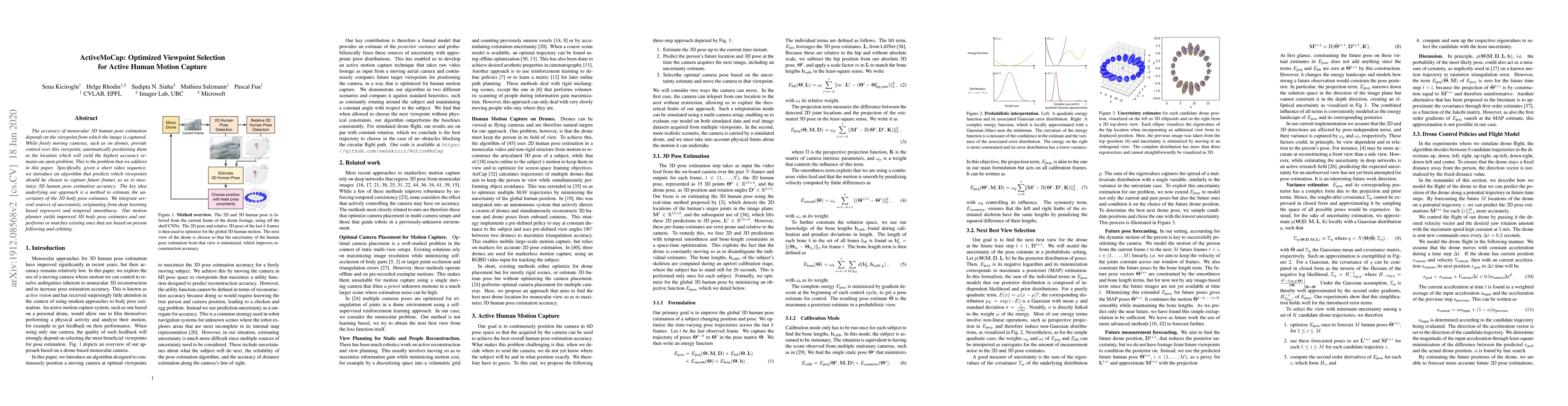 The accuracy of monocular 3D human pose estimation depends on the viewpoint from which the image is captured. While freely moving cameras, such as on drones, provide control over this viewpoint, automatically positioning them at the location which will yield the highest accuracy remains an open problem. This is the problem that we address in this paper. Specifically, given a short video sequence, we introduce an algorithm that predicts which viewpoints should be chosen to capture future frames so as to maximize 3D human pose estimation accuracy. The key idea underlying our approach is a method to estimate the uncertainty of the 3D body pose estimates. We integrate several sources of uncertainty, originating from deep learning based regressors and temporal smoothness. Our motion planner yields improved 3D body pose estimates and outperforms or matches existing ones that are based on person following and orbiting.